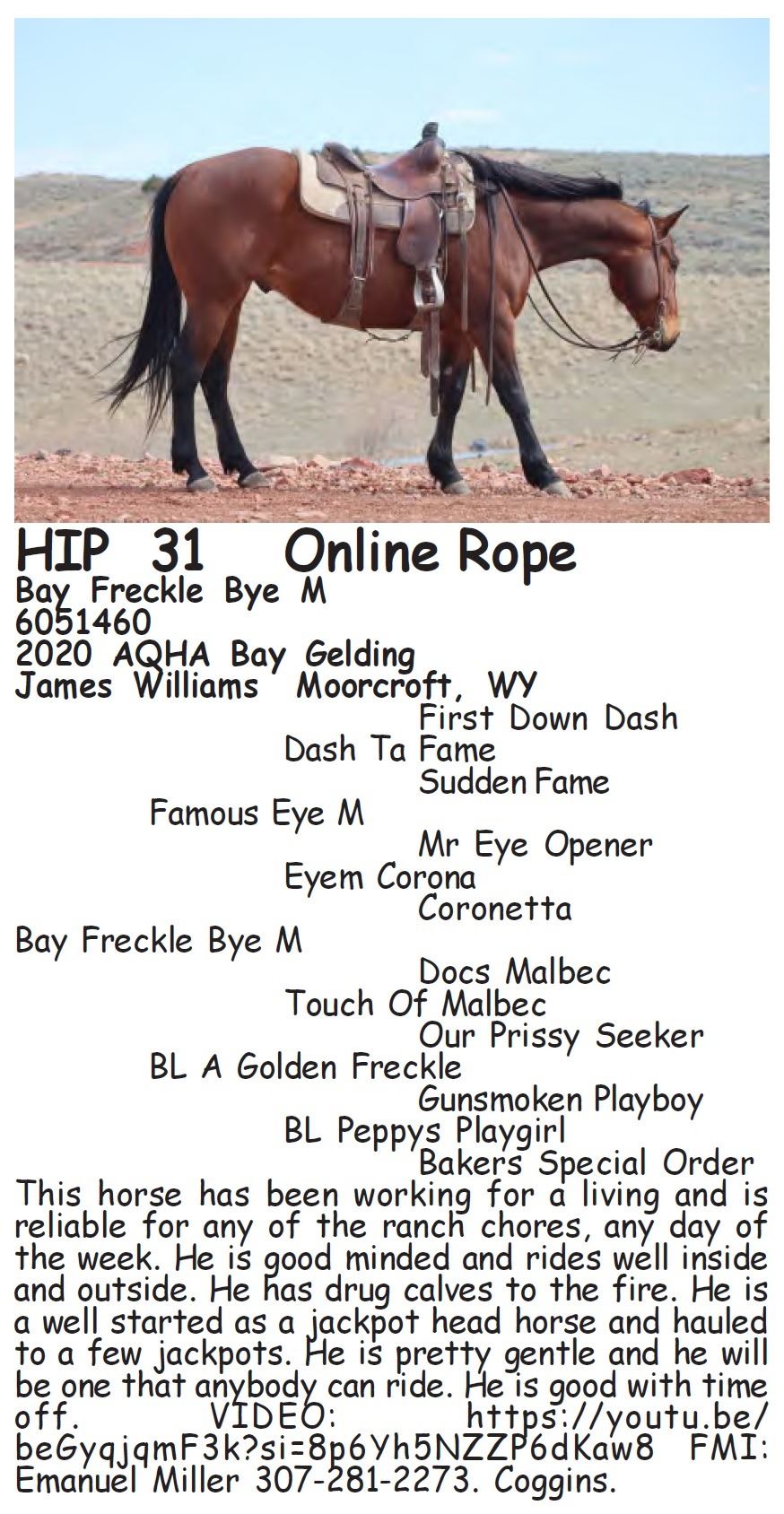 Bay Freckle Bye M - 6051460 - 2020 AQHA Bay Gelding - James Williams, Moorcroft, WY - This horse has been working for a living and is reliable for any of the ranch chores, any day of the week. He is good minded and rides well inside and outside. He has drug calves to the fire. He is a well started as a jackpot head horse and hauled to a few jackpots. He is pretty gentle and he will be one that anybody can ride. He is good with time off. VIDEO: https://youtu.be/beGyqjqmF3k?si=8p6Yh5NZZP6dKaw8 FMI: Emanuel Miller 307-281-2273. Coggins.