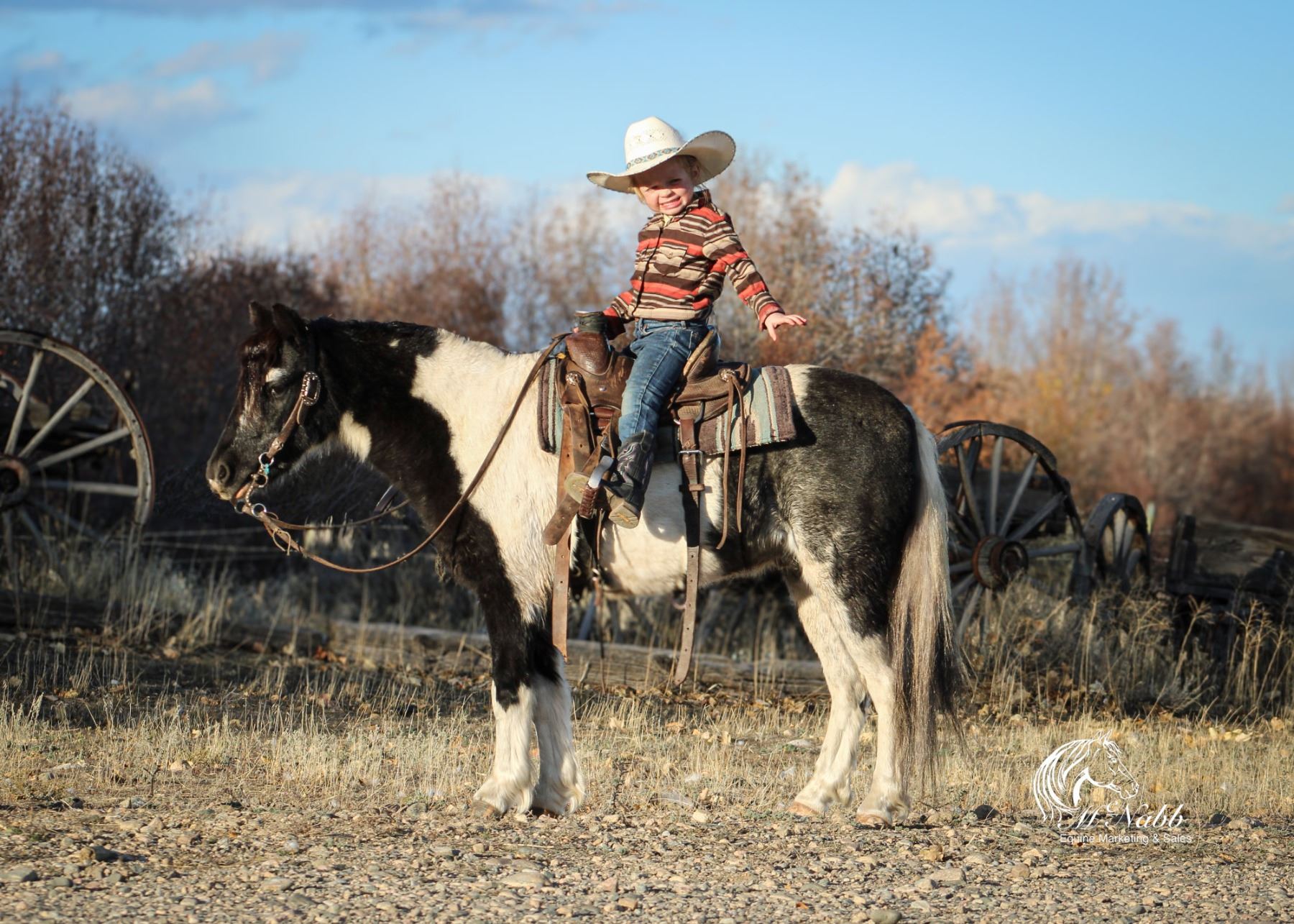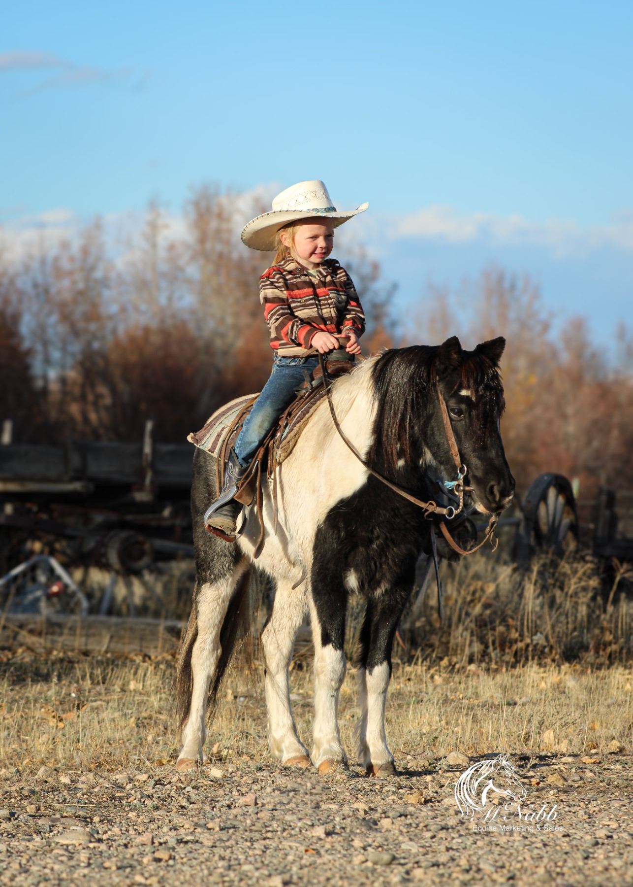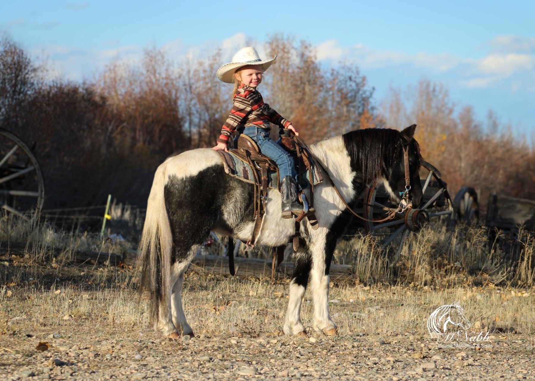 Bentley is a well broke pony. He stands 43″ tall and weighs 400lbs. He is gentle and kind, safe for all ages of kids. He does like to step out and has a little more go but isn’t hot or hyper. He is always willing to do what you ask and go where he is pointed. He is great on a lead line too. Bently is friendly, easy to catch and good with his feet. He has been trail rode all over the mountains and is hobble broke. You can rope on him and he makes a handy pony for a ranch kid. He is good with all types of livestock including llamas, pigs, goats and poultry. He will ride out by himself. He rides well in the arena, easy trots, lopes, knows his leads and has a good stop. Note from Ian: Both my little sister and I have rode this pony and he is a good one. Willing to hold for up to 10 days at no charge and can help arrange transportation.