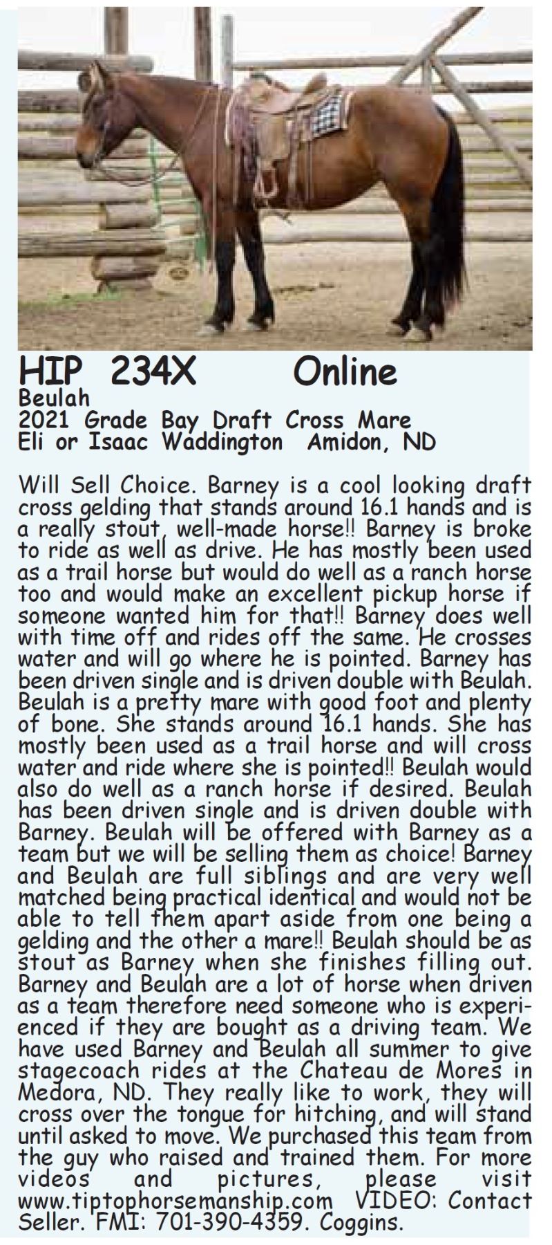 Will Sell Choice. Barney is a cool looking draft cross gelding that stands around 16.1 hands and is a really stout, well-made horse!! Barney is broke to ride as well as drive. He has mostly been used as a trail horse but would do well as a ranch horse too and would make an excellent pickup horse if someone wanted him for that!! Barney does well with time off and rides off the same. He crosses water and will go where he is pointed. Barney has been driven single and is driven double with Beulah. Beulah is a pretty mare with good foot and plenty of bone. She stands around 16.1 hands. She has mostly been used as a trail horse and will cross water and ride where she is pointed!! Beulah would also do well as a ranch horse if desired. Beulah has been driven single and is driven double with Barney. Beulah will be offered with Barney as a team but we will be selling them as choice! Barney and Beulah are full siblings and are very well matched being practical identical and would not be able to tell them apart aside from one being a gelding and the other a mare!! Beulah should be as stout as Barney when she finishes filling out. Barney and Beulah are a lot of horse when driven as a team therefore need someone who is experienced if they are bought as a driving team. We have used Barney and Beulah all summer to give stagecoach rides at the Chateau de Mores in Medora, ND. They really like to work, they will cross over the tongue for hitching, and will stand until asked to move. We purchased this team from the guy who raised and trained them. For more videos and pictures, please visit www.tiptophorsemanship.com VIDEO: Contact Seller. FMI: 701-390-4359. Coggins.
