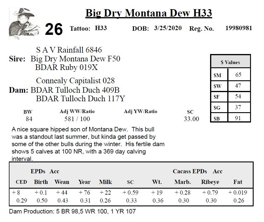 All persons who attend this sale do so at their own risk, legal or otherwise. Big Dry Angus assumes no liability for property loss or accident that may occur.