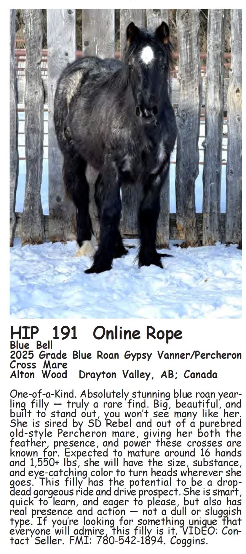 Blue Bell - 2025 Grade Blue Roan Gypsy Vanner/Percheron Cross Mare - Alton Wood, Drayton Valley, AB; Canada - One-of-a-Kind. Absolutely stunning blue roan yearling filly — truly a rare find. Big, beautiful, and built to stand out, you won’t see many like her. She is sired by SD Rebel and out of a purebred old-style Percheron mare, giving her both the feather, presence, and power these crosses are known for. Expected to mature around 16 hands and 1,550+ lbs, she will have the size, substance, and eye-catching color to turn heads wherever she goes. This filly has the potential to be a drop-dead gorgeous ride and drive prospect. She is smart, quick to learn, and eager to please, but also has real presence and action — not a dull or sluggish type. If you’re looking for something unique that everyone will admire, this filly is it. VIDEO: Contact Seller. FMI: 780-542-1894. Coggins.