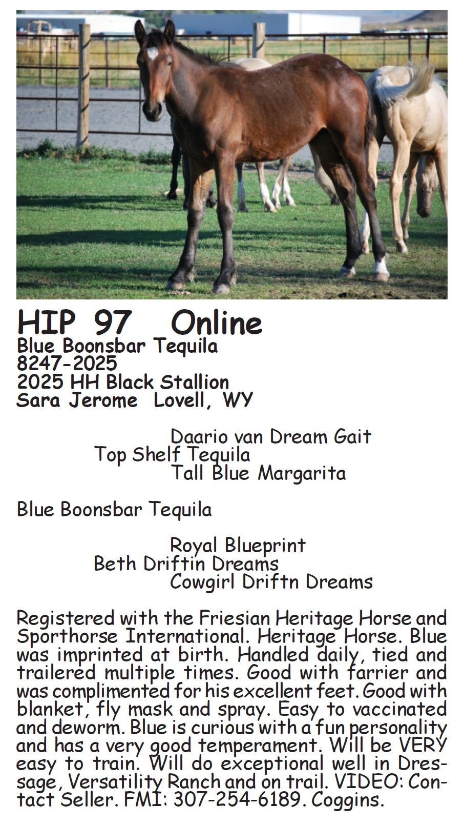 2025 HH Black Stallion x Top Shelf Tequila x Daario van Dream Gait out of Beth Driftin Dreams x Royal Blueprint. Registered with the Friesian Heritage Horse and Sporthorse International. Heritage Horse. Blue was imprinted at birth. Handled daily, tied and trailered multiple times. Good with farrier and was complimented for his excellent feet. Good with blanket, fly mask and spray. Easy to vaccinated and deworm. Blue is curious with a fun personality and has a very good temperament. Will be VERY easy to train. Will do exceptional well in Dressage, Versatility Ranch and on trail. VIDEO: Contact Seller. FMI: 307-254-6189. Coggins.