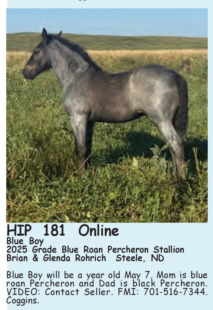 Blue Boy - 2025 Grade Blue Roan Percheron Stallion - Brian & Glenda Rohrich, Steele, ND - Blue Boy will be a year old May 7, Mom is blue roan Percheron and Dad is black Percheron. VIDEO: Contact Seller. FMI: 701-516-7344. Coggins.