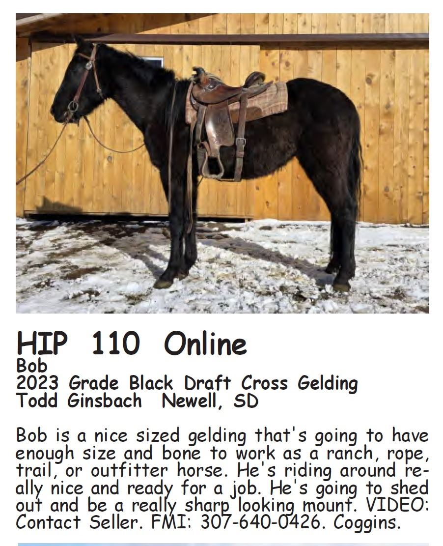 Bob - 2023 Grade Black Draft Cross Gelding - Todd Ginsbach, Newell, SD - Bob is a nice sized gelding that's going to have enough size and bone to work as a ranch, rope, trail, or outfitter horse. He's riding around really nice and ready for a job. He's going to shed out and be a really sharp looking mount. VIDEO: Contact Seller. FMI: 307-640-0426. Coggins.