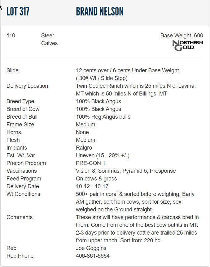 CommentsThese strs will have performance & carcass bred in them. Come from one of the best cow outfits in MT. 2-3 days prior to delivery cattle are trailed 25 miles from upper ranch. Sort from 220 hd.