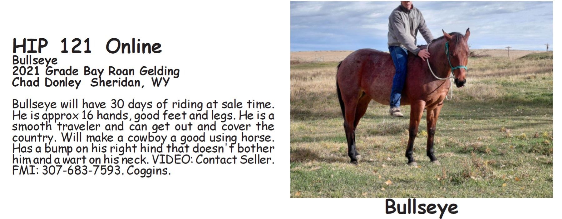 Bullseye will have 30 days of riding at sale time. He is approx 16 hands, good feet and legs. He is a smooth traveler and can get out and cover the country. Will make a cowboy a good using horse. Has a bump on his right hind that doesn't bother him and a wart on his neck. VIDEO: Contact Seller. FMI: 307-683-7593. Coggins.