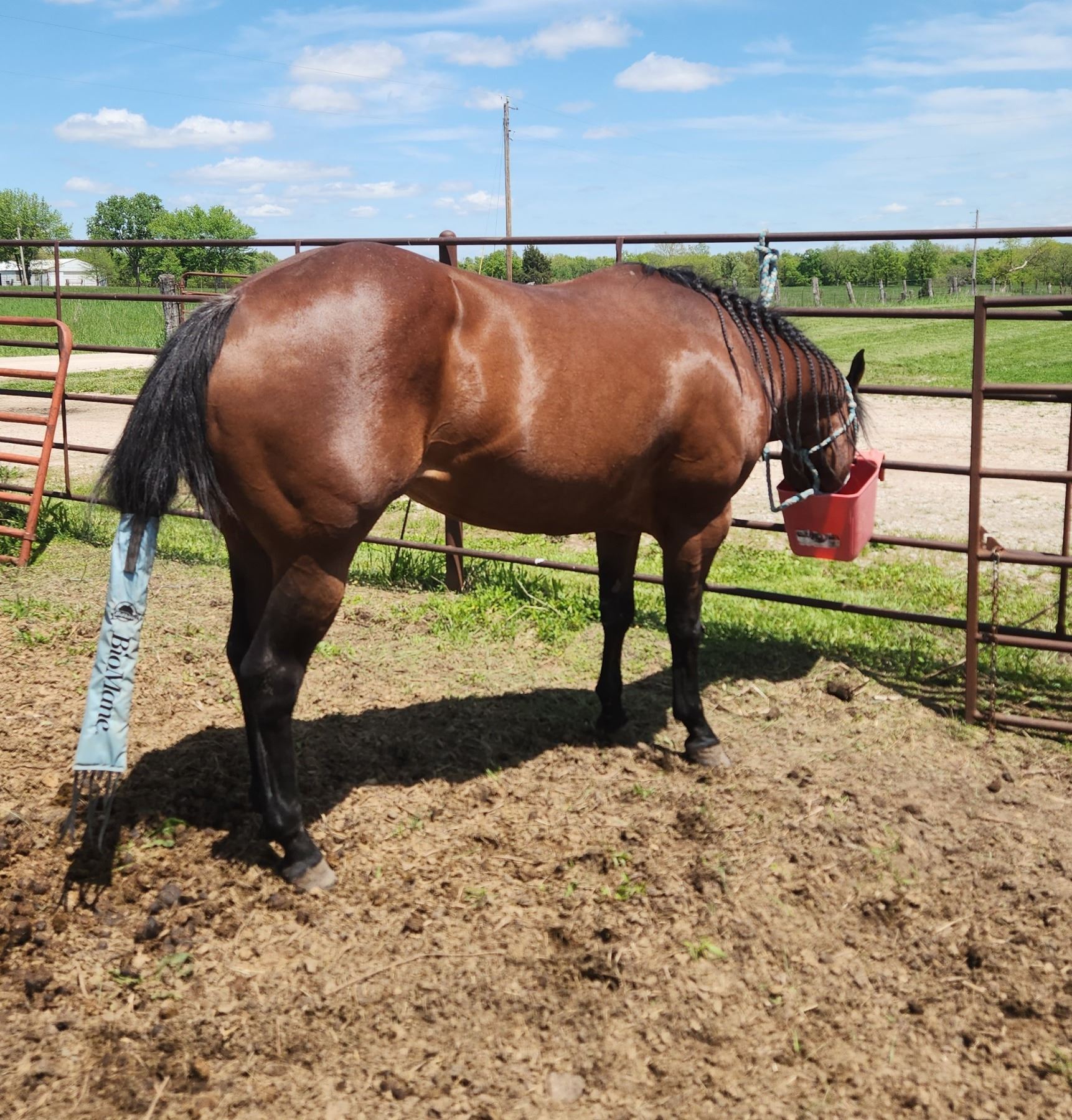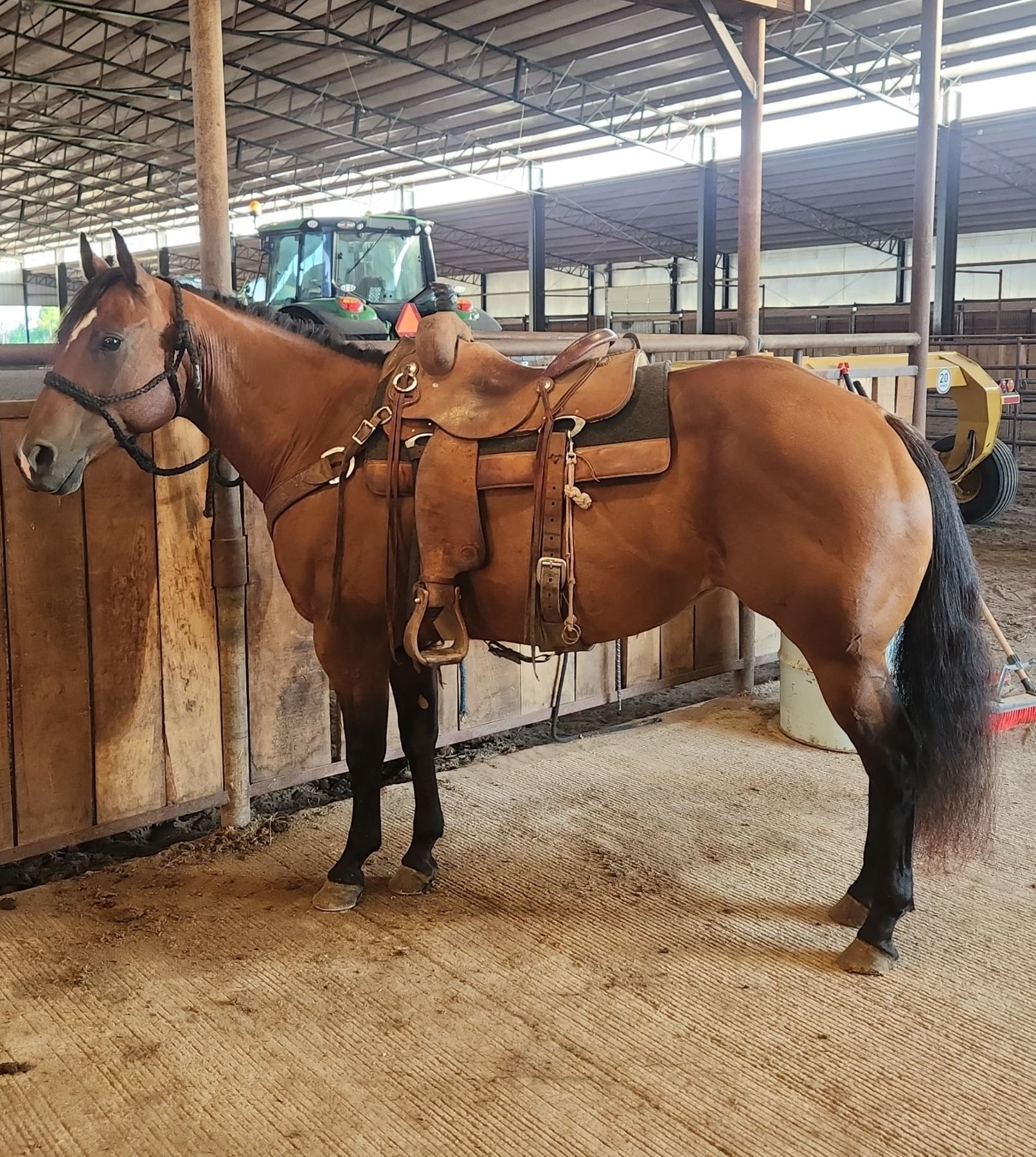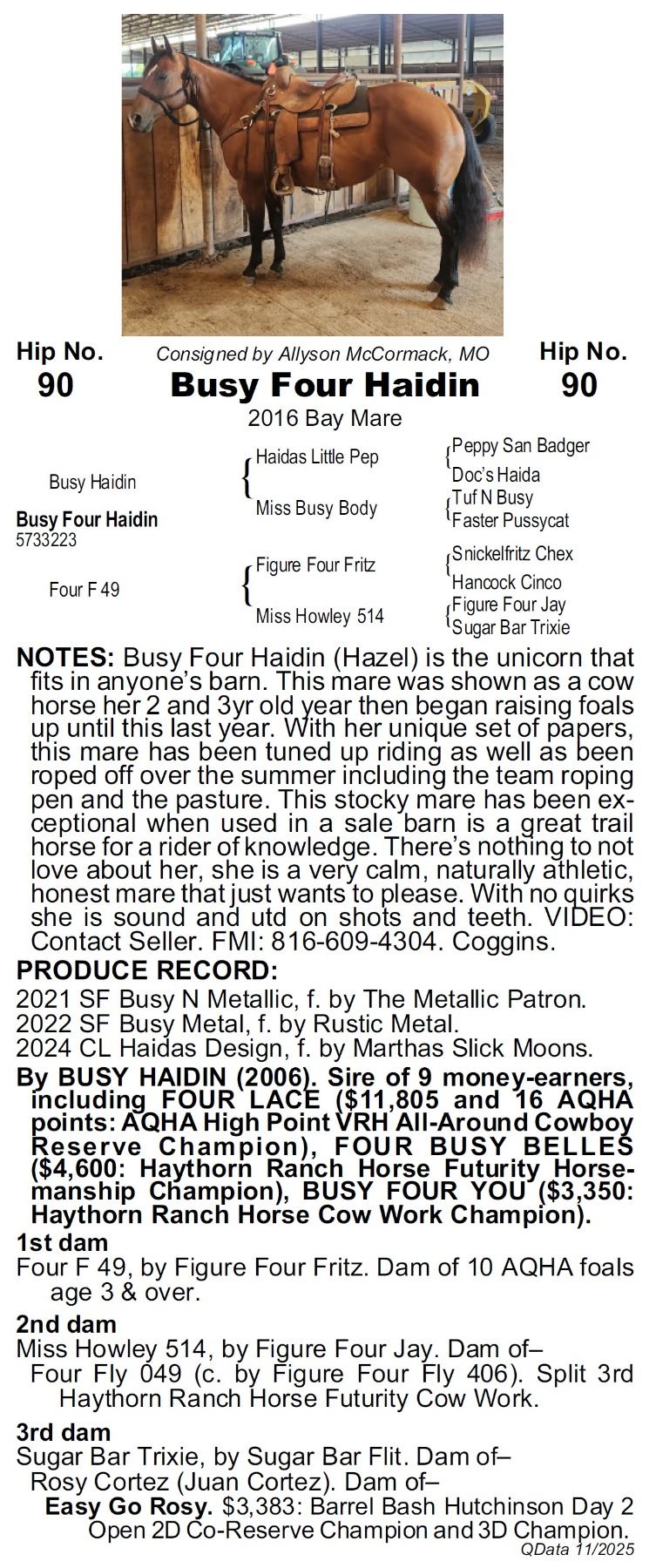 2016 AQHA Bay Mare x Busy Haidin x Haidas Little Pep out of Four F 49 x Figure Four Fritz. Busy Four Haidin (Hazel) is the unicorn that fits in anyone's barn. This mare was shown as a cow horse her 2 and 3yr old year then began raising foals up until this last year. With her unique set of papers, this mare has been tuned up riding as well as been roped off over the summer including the team roping pen and the pasture. This stocky mare has been exceptional in a sale barn with her great cow sense but she’s not only a great using horse, she is a great trail horse for a rider of knowledge. There's nothing to not love about her, she is a very calm, naturally athletic, honest mare that just wants to please. With no quirks she is sound and utd on shots and teeth. VIDEO: Contact Seller. FMI: 816-609-4304. Coggins.