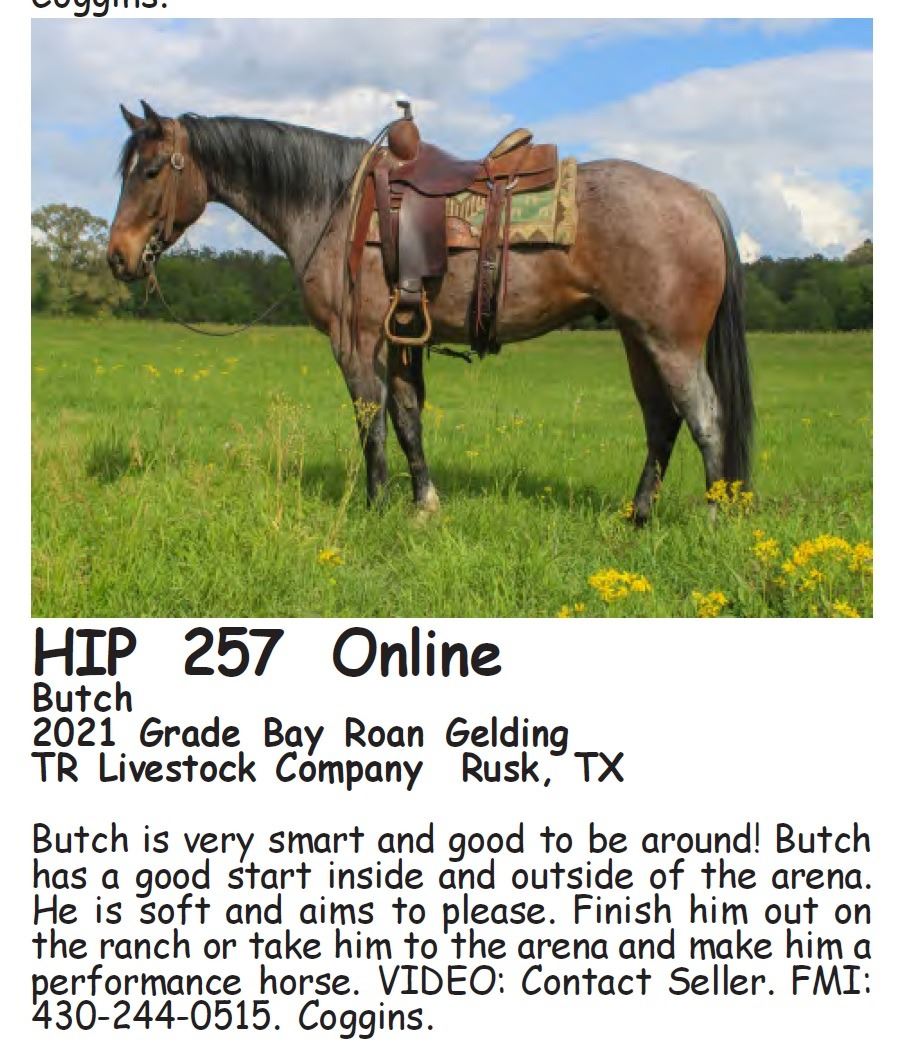 Butch - Grade Bay Roan Gelding - TR Livestock Company, Rusk, TX - Butch is very smart and good to be around! Butch has a good start inside and outside of the arena. He is soft and aims to please. Finish him out on the ranch or take him to the arena and make him a performance horse. VIDEO: Contact Seller. FMI: 430-244-0515. Coggins.