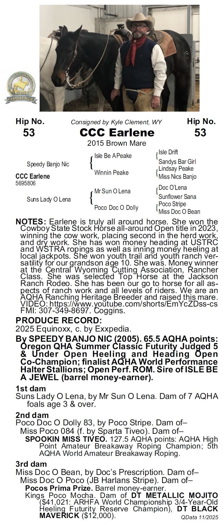 2015 AQHA Brown Mare x Speedy Banjo Nic x Isle Be a Peake out of Suns Lady O Lena x Mr Sun O Lena. Earlene is truly all around horse. She won the Cowboy State Stock Horse all-around Open title in 2023, winning the cow work, placing second in the herd work, and dry work. She has won money heading at USTRC and WSTRA ropings as well as inning money heeling at local jackpots. She won youth trail and youth ranch versatility for our grandson age 10. She was. Money winner at the Central Wyoming Cutting Association, Rancher Class. She was selected Top Horse at the Jackson Ranch Rodeo. She has been our go to horse for all aspects of ranch work and all levels of riders. We are an AQHA Ranching Heritage Breeder we raised and have been the only owner. VIDEO: https://youtube.com/shorts/EmYcZDss-cs FMI: 307-349-8697. Coggins.