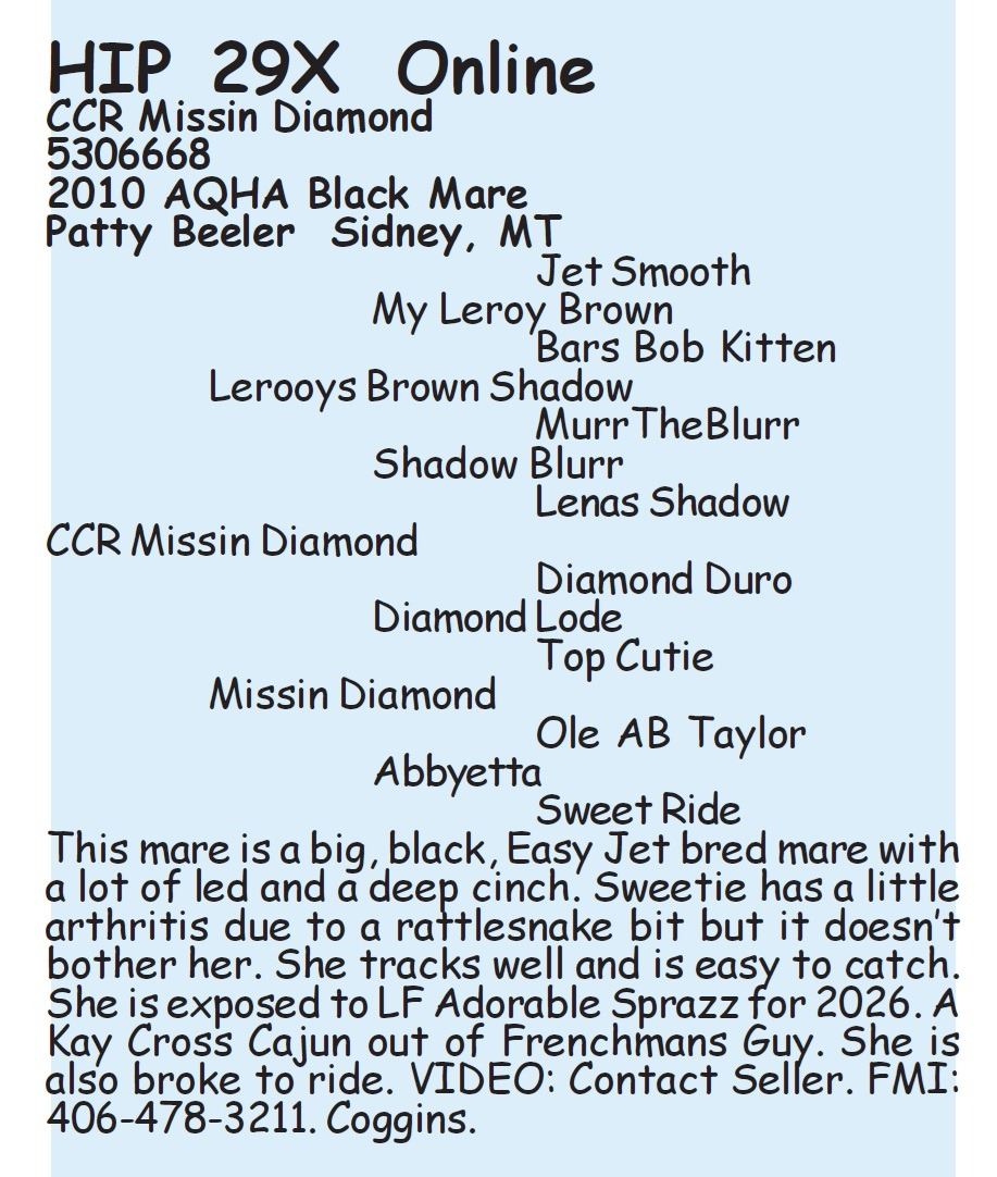 This mare is a big, black, Easy Jet bred mare with a lot of led and a deep cinch. Sweetie has a little arthritis due to a rattlesnake bit but it doesn”t bother her. She tracks well and is easy to catch. She is exposed to LF Adorable Sprazz for 2026. A Kay