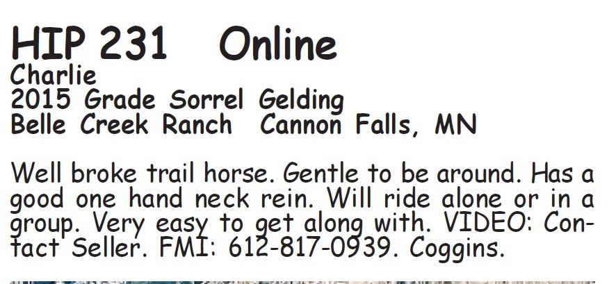 Charlie - 2015 Grade Sorrel Gelding - Belle Creek Ranch, Cannon Falls, MN - Well broke trail horse. Gentle to be around. Has a good one hand neck rein. Will ride alone or in a group. Very easy to get along with. VIDEO: Contact Seller. FMI: 612-817-0939. Coggins.