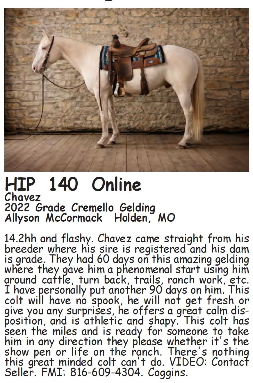 Chavez - 2022 Grade Cremello Gelding - Allyson McCormack, Holden, MO - 14.2hh and flashy. Chavez came straight from his breeder where his sire is registered and his dam is grade. They had 60 days on this amazing gelding where they gave him a phenomenal start using him around cattle, turn back, trails, ranch work, etc. I have personally put another 90 days on him. This colt will have no spook, he will not get fresh or give you any surprises, he offers a great calm disposition, and is athletic and shapy. This colt has seen the miles and is ready for someone to take him in any direction they please whether it's the show pen or life on the ranch. There's nothing this great minded colt can't do. VIDEO: Contact Seller. FMI: 816-609-4304. Coggins.