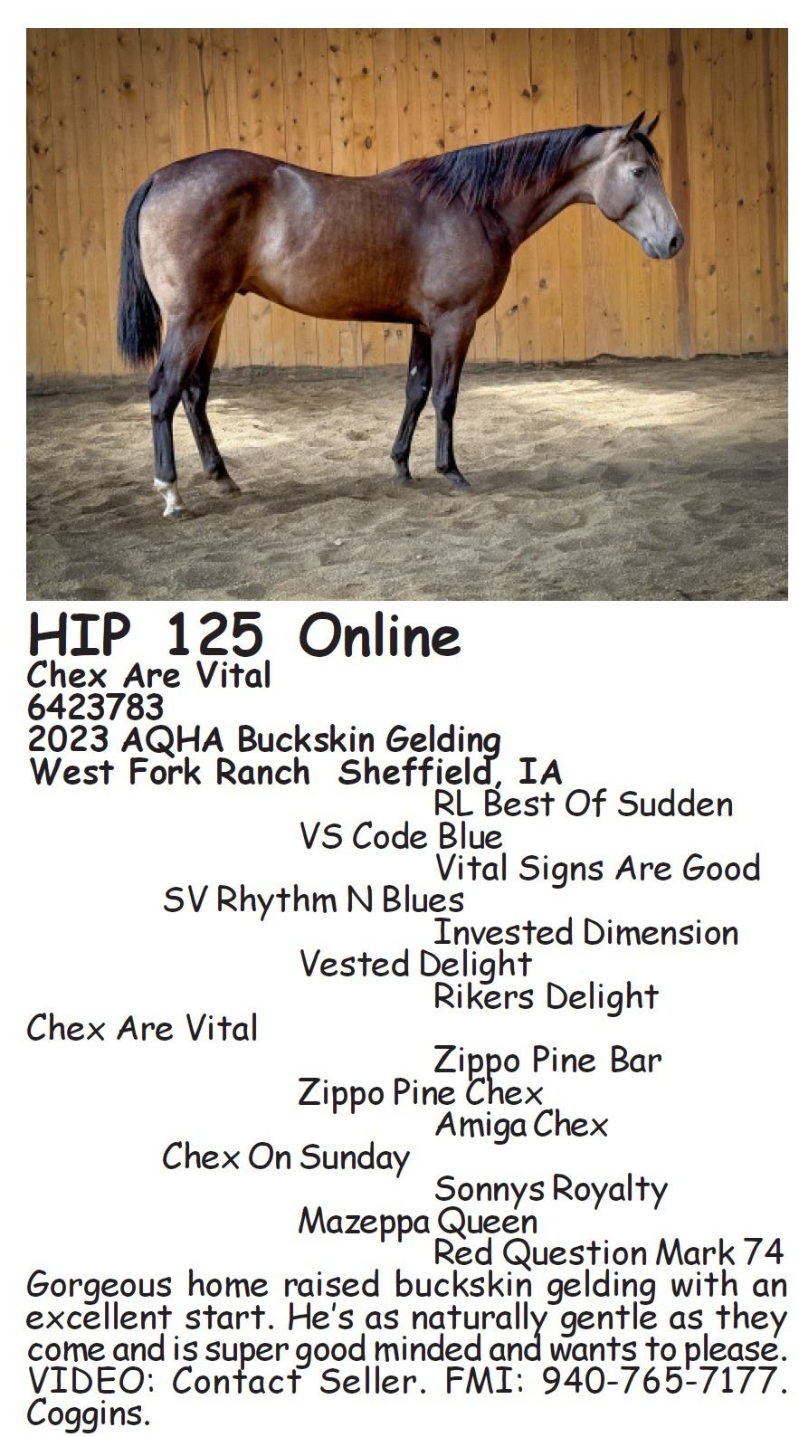 2023 AQHA Buckskin Gelding x SV Rhythm N Blues x VS Code Blue out of Chex On Sunday x Zippo Pine Chex. Gorgeous home raised buckskin gelding with an excellent start. He’s as naturally gentle as they come and is super good minded and wants to please. VIDEO: Contact Seller. FMI: 940-765-7177. Coggins.