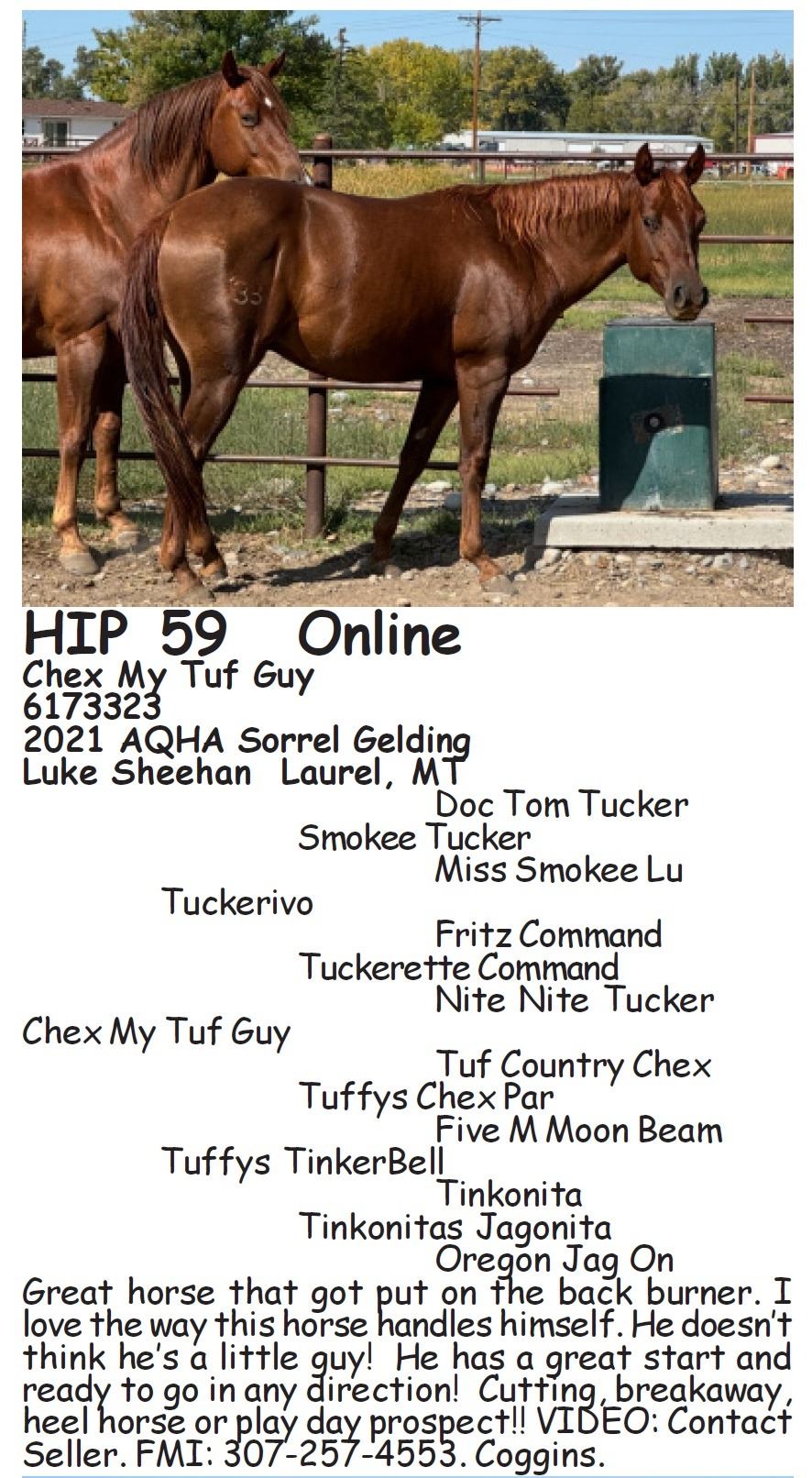 2021 AQHA Sorrel Gelding x Tuckerivo x Smokee Tucker out of Tuffys Tinkerbell x Tuffys Chex Par. Great horse that got put on the back burner. I love the way this horse handles himself. He doesn’t think he’s a little guy! He has a great start and ready to go in any direction! Cutting, breakaway, heel horse or play day prospect!! VIDEO: Contact Seller. FMI: 307-257-4553. Coggins.
