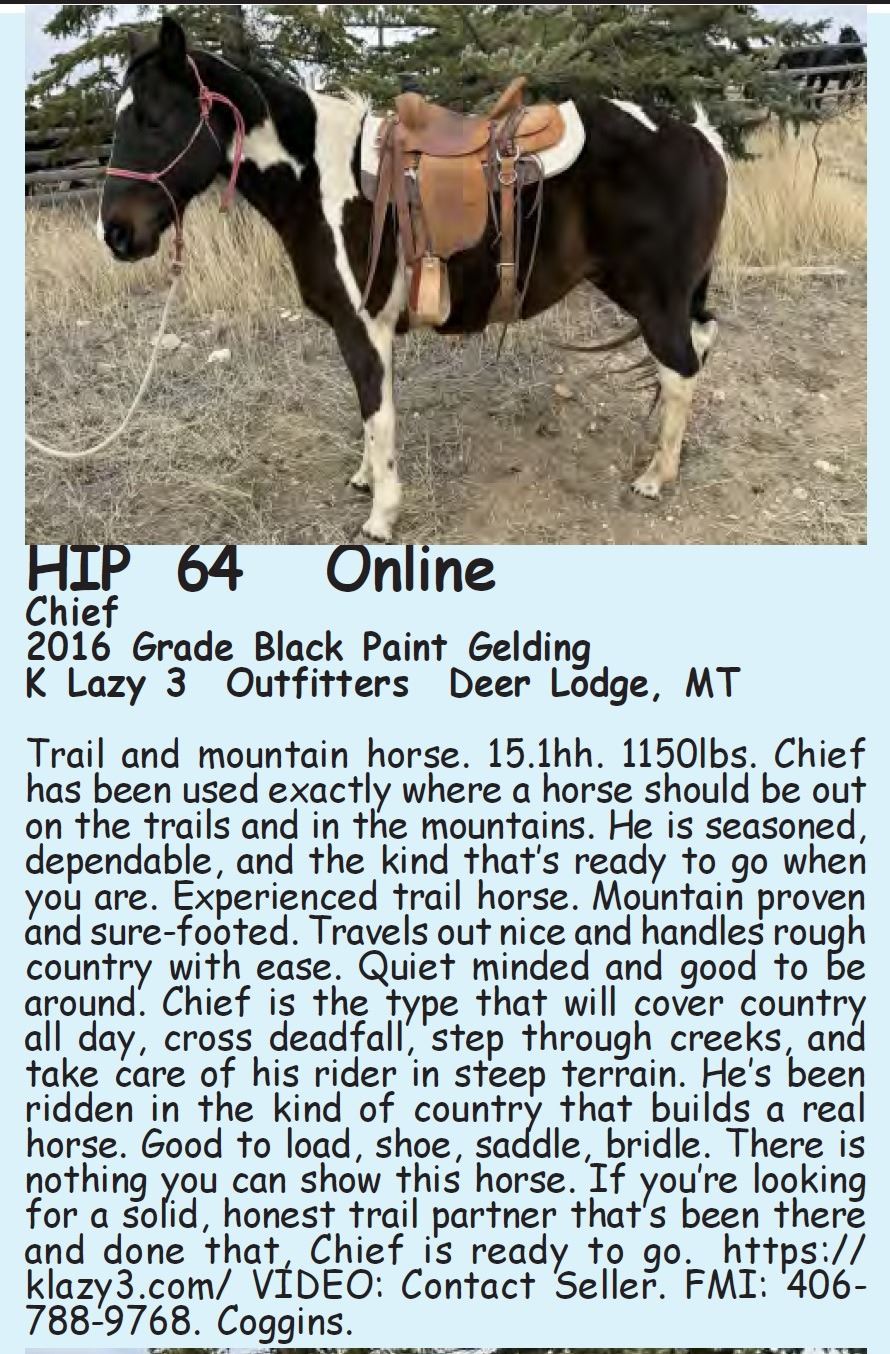 Chief - 2016 Grade Black Paint Gelding - K Lazy 3 Outfitters, Deer Lodge, MT - Trail and mountain horse. 15.1hh. 1150lbs. Chief has been used exactly where a horse should be out on the trails and in the mountains. He is seasoned, dependable, and the kind that’s ready to go when you are. Experienced trail horse. Mountain proven and sure-footed. Travels out nice and handles rough country with ease. Quiet minded and good to be around. Chief is the type that will cover country all day, cross deadfall, step through creeks, and take care of his rider in steep terrain. He’s been ridden in the kind of country that builds a real horse. Good to load, shoe, saddle, bridle. There is nothing you can show this horse. If you’re looking for a solid, honest trail partner that’s been there and done that, Chief is ready to go. https://klazy3.com/ VIDEO: Contact Seller. FMI: 406-788-9768. Coggins.