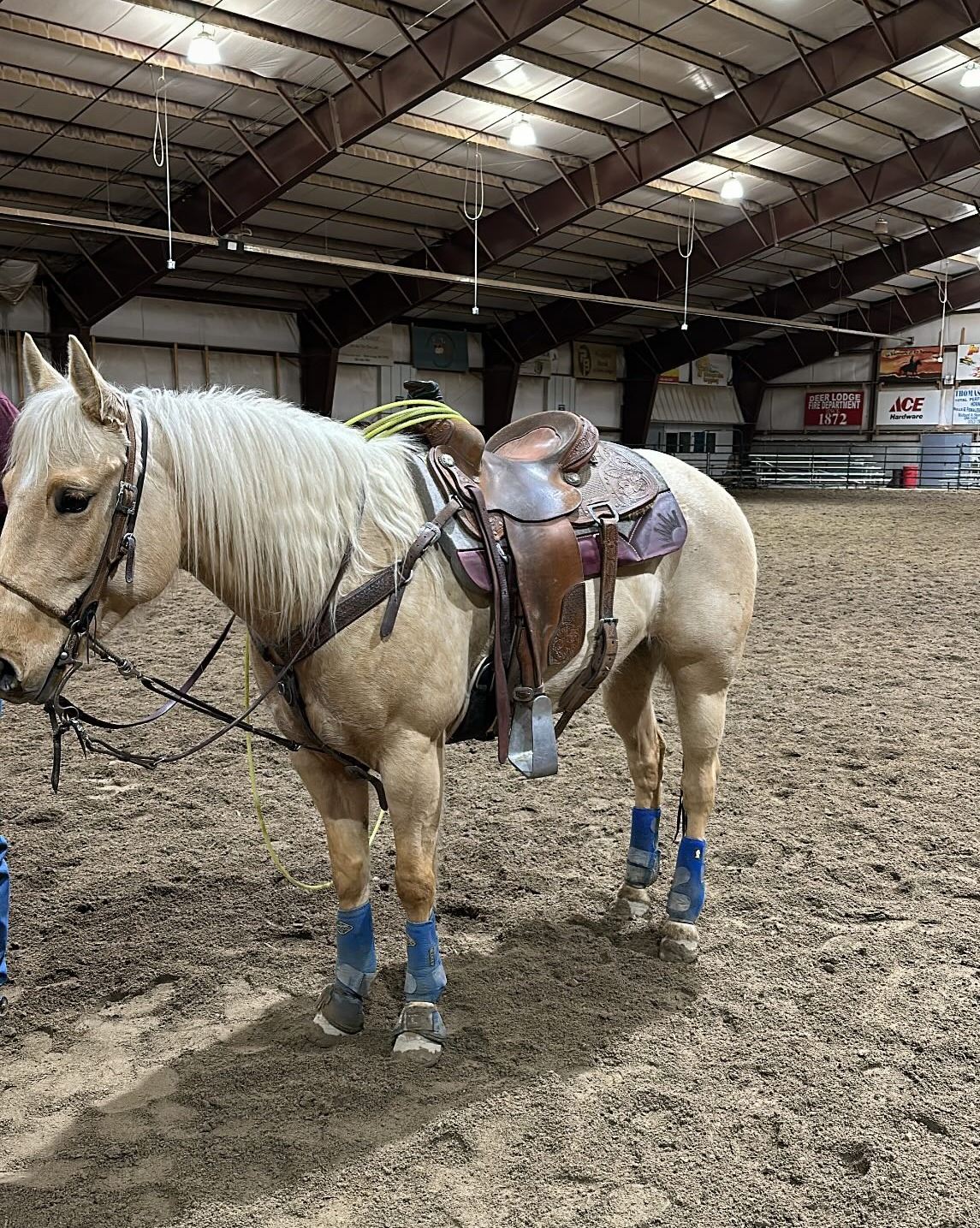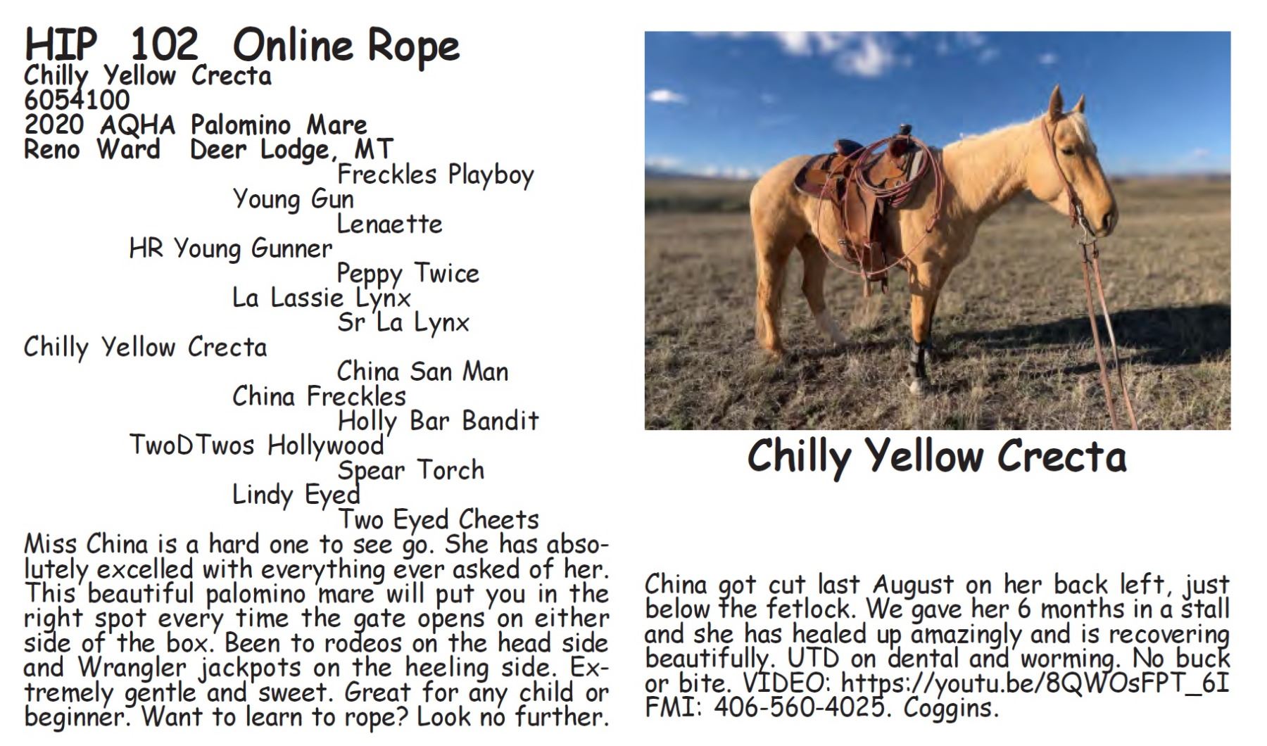 Chilly Yellow Crecta - 6054100 - 2020 AQHA Palomino Mare - Reno Ward, Deer Lodge, MT - Miss China is a hard one to see go. She has absolutely excelled with everything ever asked of her. This beautiful palomino mare will put you in the right spot every time the gate opens on either side of the box. Been to rodeos on the head side and Wrangler jackpots on the heeling side. Extremely gentle and sweet. Great for any child or beginner. Want to learn to rope? Look no further. China got cut last August on her back left, just below the fetlock. We gave her 6 months in a stall and she has healed up amazingly and is recovering beautifully. UTD on dental and worming. No buck or bite. VIDEO: https://youtu.be/8QWOsFPT_6I FMI: 406-560-4025. Coggins.