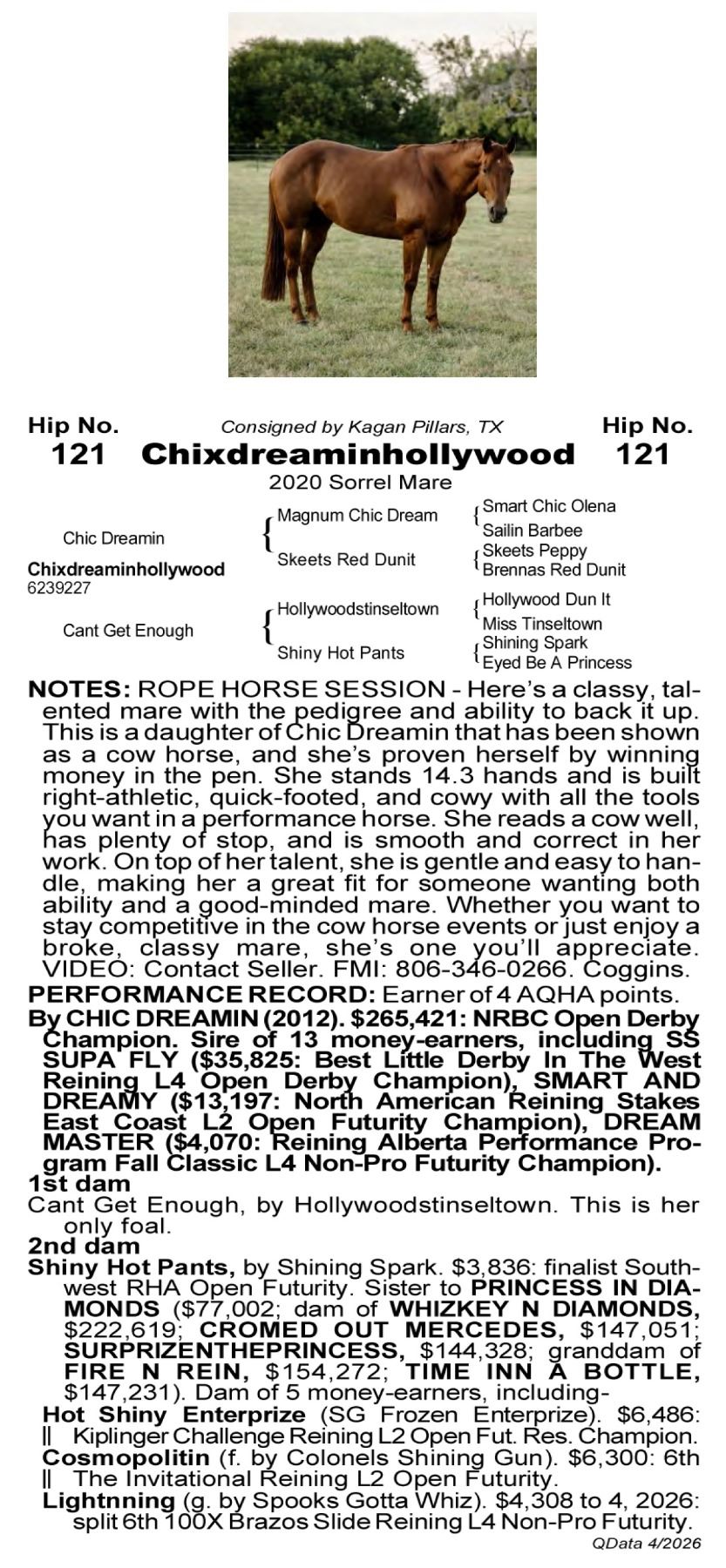 ChixDreaminHollywood - 6239227 - 2020 AQHA Sorrel Mare - Kagan Pillars, Canyon, TX - Here’s a classy, talented mare with the pedigree and ability to back it up. This is an own daughter of Chic Dreamin that has been shown as a cow horse, and she’s proven herself by winning money in the pen. She stands 14.3 hands and is built right—athletic, quick-footed, and cowy with all the tools you want in a performance horse. She reads a cow well, has plenty of stop, and is smooth and correct in her work. On top of her talent, she is gentle and easy to handle, making her a great fit for someone wanting both ability and a good-minded mare. Whether you want to stay competitive in the cow horse events or just enjoy a broke, classy mare, she’s one you’ll appreciate. VIDEO: Contact Seller. FMI: 806-346-0266. Coggins.