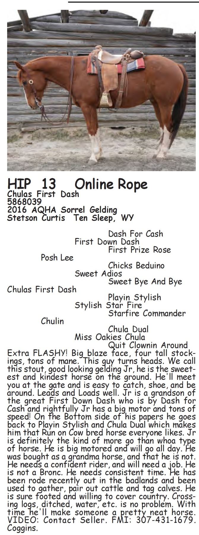 Chulas First Dash - 5868039 - 2016 AQHA Sorrel Gelding - Stetson Curtis, Ten Sleep, WY - Extra FLASHY! Big blaze face, four tall stockings, tons of mane. This guy turns heads. We call this stout, good looking gelding Jr, he is the sweetest and kindest horse on the ground. He'll meet you at the gate and is easy to catch, shoe, and be around. Leads and Loads well. Jr is a grandson of the great First Down Dash who is by Dash for Cash and rightfully Jr has a big motor and tons of speed! On the Bottom side of his papers he goes back to Playin Stylish and Chula Dual which makes him that Run on Cow bred horse everyone likes. Jr is definitely the kind of more go than whoa type of horse. He is big motored and will go all day. He was bought as a grandma horse, and that he is not. He needs a confident rider, and will need a job. He is not a Bronc. He needs consistent time. He has been rode recently out in the badlands and been used to gather, pair out cattle and tag calves. He is sure footed and willing to cover country. Crossing logs, ditched, water, etc. is no problem. With time he'll make someone a pretty neat horse. VIDEO: Contact Seller. FMI: 307-431-1679. Coggins.