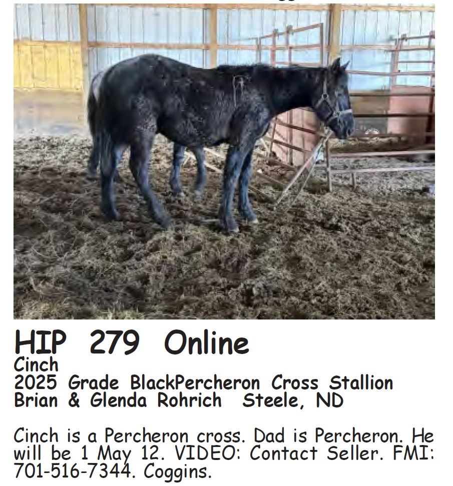 Cinch - 2025 Grade BlackPercheron Cross Stallion - Brian & Glenda Rohrich, Steele, ND - Cinch is a Percheron cross. Dad is Percheron. He will be 1 May 12. VIDEO: Contact Seller. FMI: 701-516-7344. Coggins.