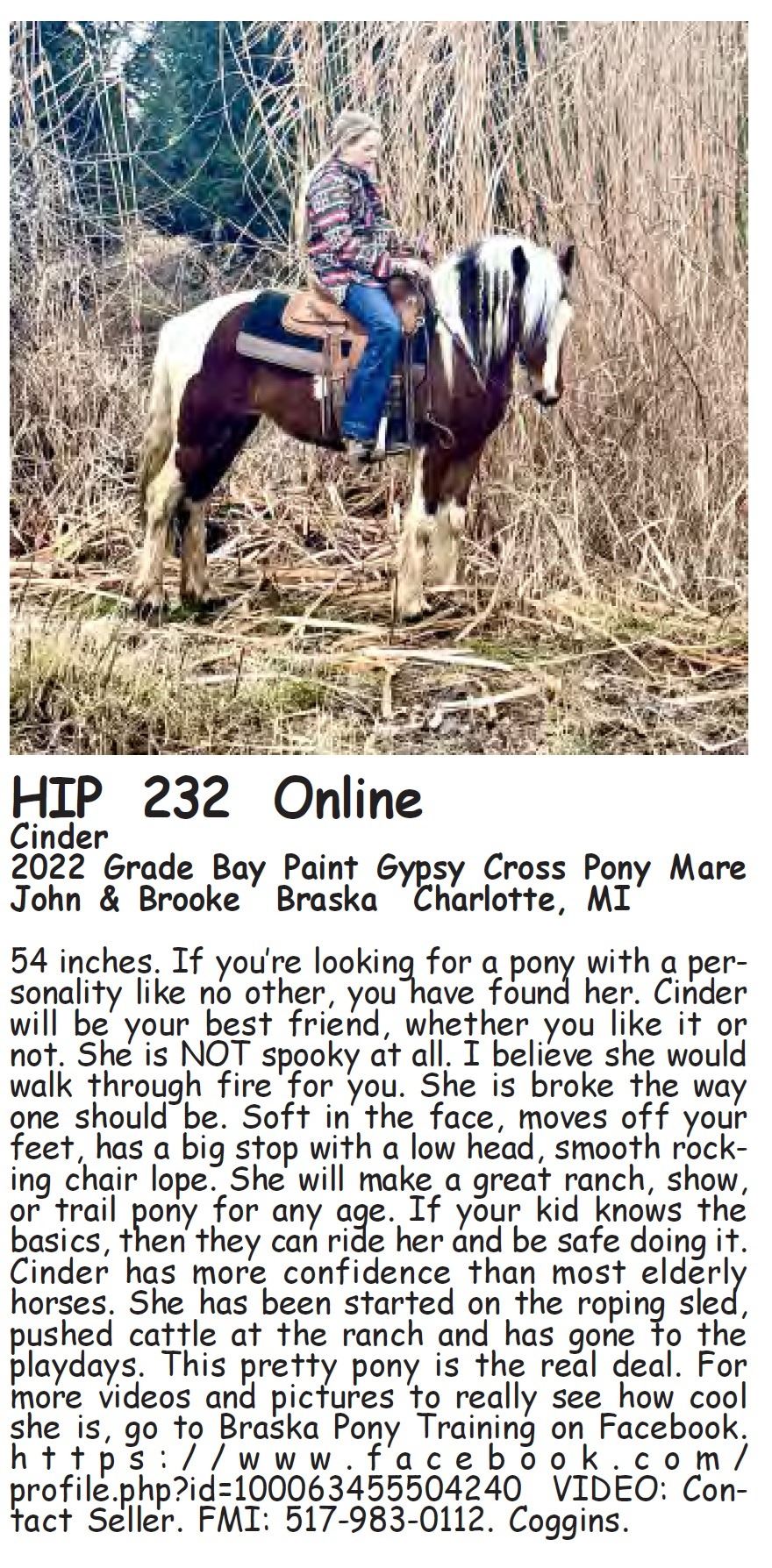 Cinder - 2022 Grade Bay Paint Gypsy Cross Pony Mare - John & Brooke Braska, Charlotte, MI - 54 inches. If you’re looking for a pony with a personality like no other, you have found her. Cinder will be your best friend, whether you like it or not. She is NOT spooky at all. I believe she would walk through fire for you. She is broke the way one should be. Soft in the face, moves off your feet, has a big stop with a low head, smooth rocking chair lope. She will make a great ranch, show, or trail pony for any age. If your kid knows the basics, then they can ride her and be safe doing it. Cinder has more confidence than most elderly horses. She has been started on the roping sled, pushed cattle at the ranch and has gone to the playdays. This pretty pony is the real deal. For more videos and pictures to really see how cool she is, go to Braska Pony Training on Facebook. https://www.facebook.com/profile.php?id=100063455504240 VIDEO: Contact Seller. FMI: 517-983-0112. Coggins.