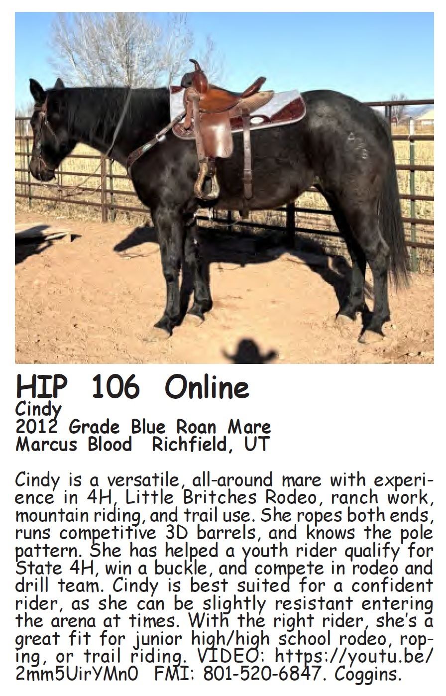 Cindy - 2012 Grade Blue Roan Mare - Marcus Blood, Richfield, UT - Cindy is a versatile, all-around mare with experience in 4H, Little Britches Rodeo, ranch work, mountain riding, and trail use. She ropes both ends, runs competitive 3D barrels, and knows the pole pattern. She has helped a youth rider qualify for State 4H, win a buckle, and compete in rodeo and drill team. Cindy is best suited for a confident rider, as she can be slightly resistant entering the arena at times. With the right rider, she’s a great fit for junior high/high school rodeo, roping, or trail riding. VIDEO: https://youtu.be/2mm5UirYMn0 FMI: 801-520-6847. Coggins.