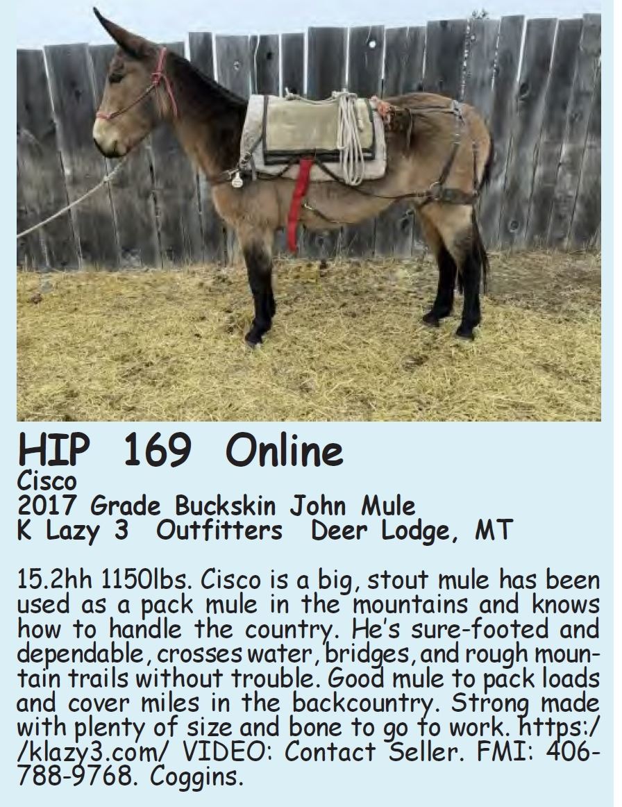Cisco - 2017 Grade Buckskin John Mule - K Lazy 3 Outfitters, Deer Lodge, MT - 15.2hh 1150lbs. Cisco is a big, stout mule has been used as a pack mule in the mountains and knows how to handle the country. He’s sure-footed and dependable, crosses water, bridges, and rough mountain trails without trouble. Good mule to pack loads and cover miles in the backcountry. Strong made with plenty of size and bone to go to work. https://klazy3.com/ VIDEO: Contact Seller. FMI: 406-788-9768. Coggins.