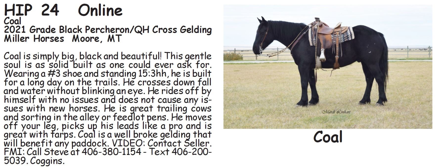 Coal is simply big, black and beautiful! This gentle soul is as solid built as one could ever ask for. Wearing a #3 shoe and standing 15:3hh, he is built for a long day on the trails. He crosses down fall and water without blinking an eye. He rides off by himself with no issues and does not cause any issues with new horses. He is great trailing cows and sorting in the alley or feedlot pens. He moves off your leg, picks up his leads like a pro and is great with tarps. Coal is a well broke gelding that will benefit any paddock. VIDEO: Contact Seller. FMI: Call Steve at 406-380-1154 - Text 406-200-5039. Coggins.