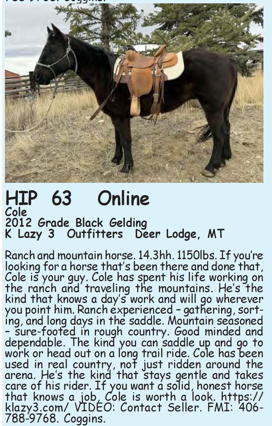 Cole - 2012 Grade Black Gelding - K Lazy 3 Outfitters, Deer Lodge, MT - Ranch and mountain horse. 14.3hh. 1150lbs. If you’re looking for a horse that’s been there and done that, Cole is your guy. Cole has spent his life working on the ranch and traveling the mountains. He’s the kind that knows a day’s work and will go wherever you point him. Ranch experienced – gathering, sorting, and long days in the saddle. Mountain seasoned – sure-footed in rough country. Good minded and dependable. The kind you can saddle up and go to work or head out on a long trail ride. Cole has been used in real country, not just ridden around the arena. He’s the kind that stays gentle and takes care of his rider. If you want a solid, honest horse that knows a job, Cole is worth a look. https://klazy3.com/ VIDEO: Contact Seller. FMI: 406-788-9768. Coggins.