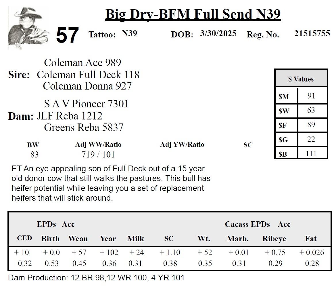 All persons who attend this sale do so at their own risk, legal or otherwise. Big Dry Angus assumes no liability for property loss or accident that may occur.