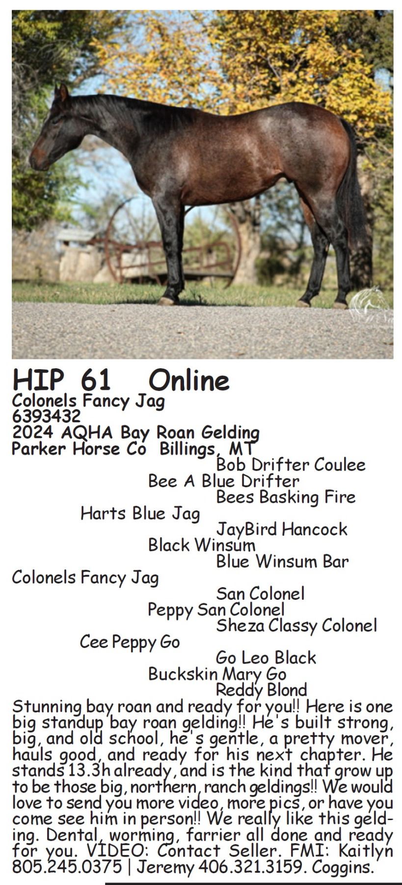 2024 AQHA Bay Roan Gelding x Harts Blue Jag x Bee A Blue Drifter out of Cee Peppy Go x Peppy San Colonel. Stunning bay roan and ready for you!! Here is one big standup bay roan gelding!! He's built strong, big, and old school, he's gentle, a pretty mover, hauls good, and ready for his next chapter. He stands 13.3h already, and is the kind that grow up to be those big, northern, ranch geldings!! We would love to send you more video, more pics, or have you come see him in person!! We really like this gelding. Dental, worming, farrier all done and ready for you. VIDEO: Contact Seller. FMI: Kaitlyn 805.245.0375 | Jeremy 406.321.3159. Coggins.