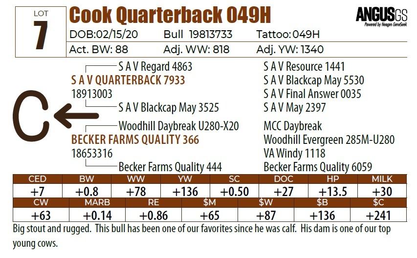 Big stout and rugged. This bull has been one of our favorites since he was calf. His dam is one of our top