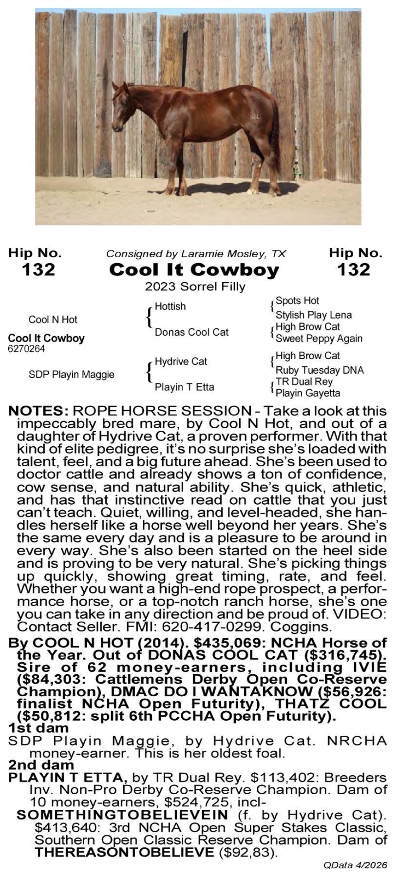 Cool It Cowboy -6270264 - 2023 AQHA Sorrel Mare - Laramie Mosley, Tennessee Colony, TX - Take a look at this impeccably bred mare—by A Cool and Hot, earner of $400,000+, and out of a daughter of High Drive Cat, a proven performer with earnings exceeding $150,000+. With that kind of elite pedigree, it’s no surprise she’s loaded with talent, feel, and a big future ahead. This little mare is one of the most fun horses you’ll swing a leg over outside. She’s been used to doctor cattle and already shows a ton of confidence, cow sense, and natural ability. She’s quick, athletic, and has that instinctive read on cattle that you just can’t teach. She’s extremely easy to get along with and has all the manners you could ask for. Quiet, willing, and level-headed, she handles herself like a horse well beyond her years. She’s the same every day and is a pleasure to be around in every way. She’s also been started on the heel side and is proving to be very natural. She’s picking things up quickly, showing great timing, rate, and feel, and looks to have a bright future in the roping pen.This is a standout young mare with elite breeding, a great mind, and all the ability in the world. Whether you want a high-end rope prospect, a performance horse, or a top-notch ranch horse, she’s one you can take in any direction and be proud of. VIDEO: Contact Seller. FMI: 620-417-0299. Coggins.