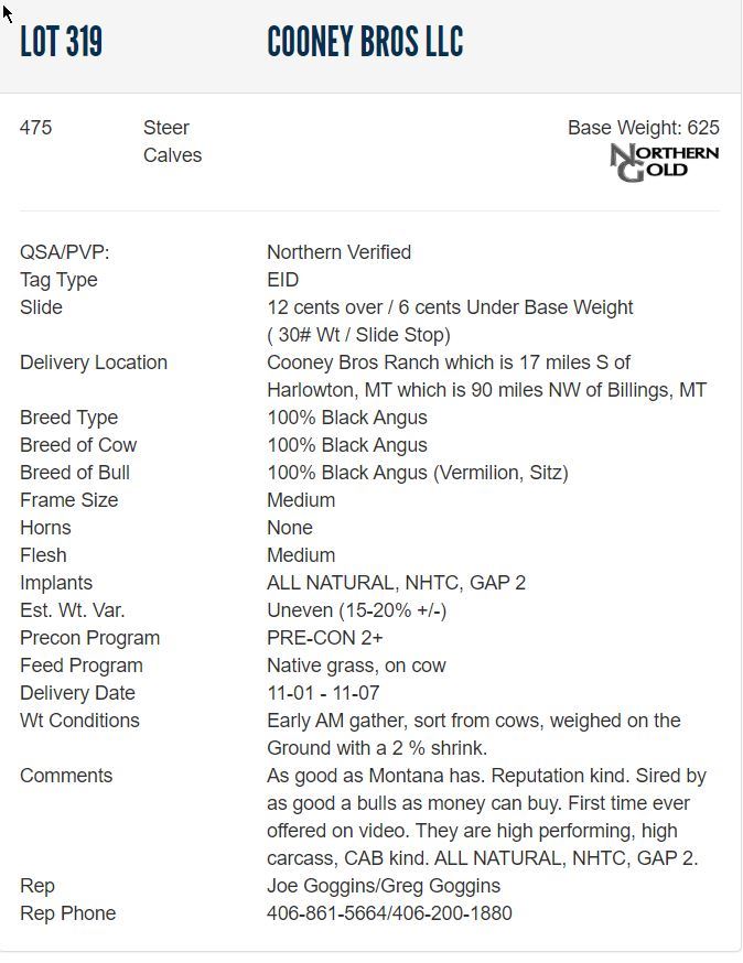 CommentsAs good as Montana has. Reputation kind. Sired by as good a bulls as money can buy. First time ever offered on video. They are high performing, high carcass, CAB kind. ALL NATURAL, NHTC, GAP 2.