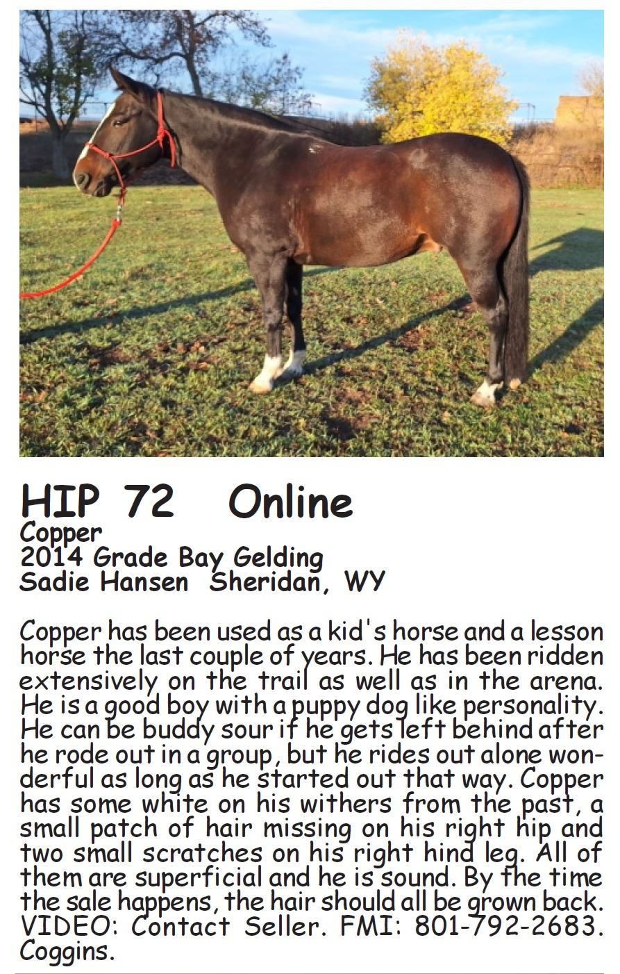 Copper has been used as a kid's horse and a lesson horse the last couple of years. He has been ridden extensively on the trail as well as in the arena. He is a good boy with a puppy dog like personality. He can be buddy sour if he gets left behind after he rode out in a group, but he rides out alone wonderful as long as he started out that way. Copper has some white on his withers from the past, a small patch of hair missing on his right hip and two small scratches on his right hind leg. All of them are superficial and he is sound. By the time the sale happens, the hair should all be grown back. VIDEO: Contact Seller. FMI: 801-792-2683. Coggins.
