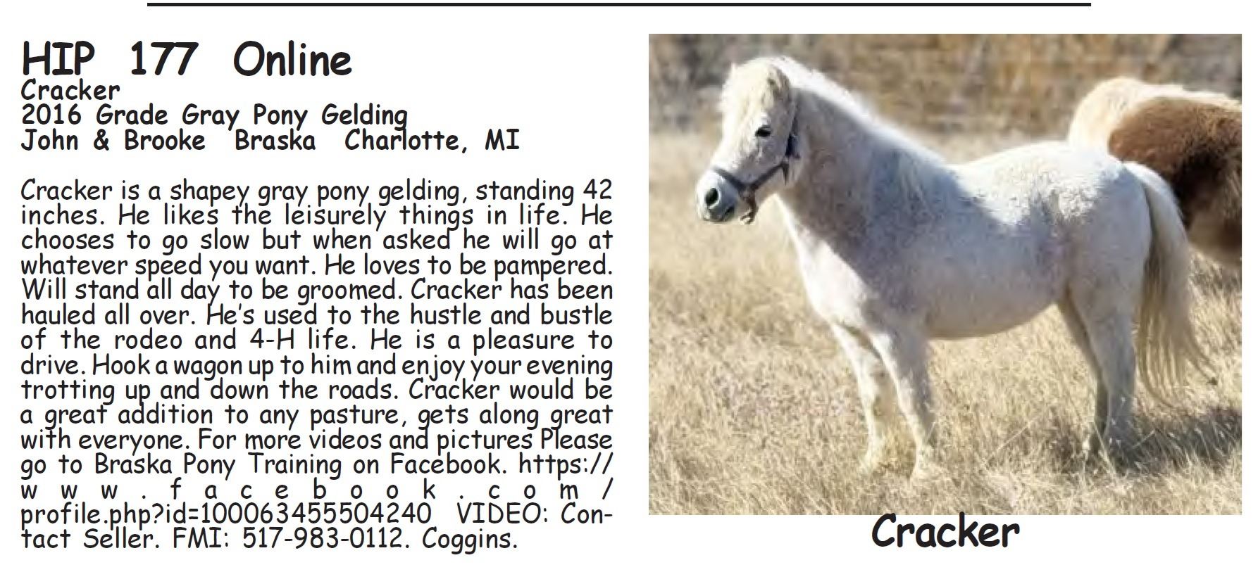 Cracker - 2016 Grade Gray Pony Gelding - John & Brooke Braska, Charlotte, MI - Cracker is a shapey gray pony gelding, standing 42 inches. He likes the leisurely things in life. He chooses to go slow but when asked he will go at whatever speed you want. He loves to be pampered. Will stand all day to be groomed. Cracker has been hauled all over. He’s used to the hustle and bustle of the rodeo and 4-H life. He is a pleasure to drive. Hook a wagon up to him and enjoy your evening trotting up and down the roads. Cracker would be a great addition to any pasture, gets along great with everyone. For more videos and pictures Please go to Braska Pony Training on Facebook. https://www.facebook.com/profile.php?id=100063455504240 VIDEO: Contact Seller. FMI: 517-983-0112. Coggins.