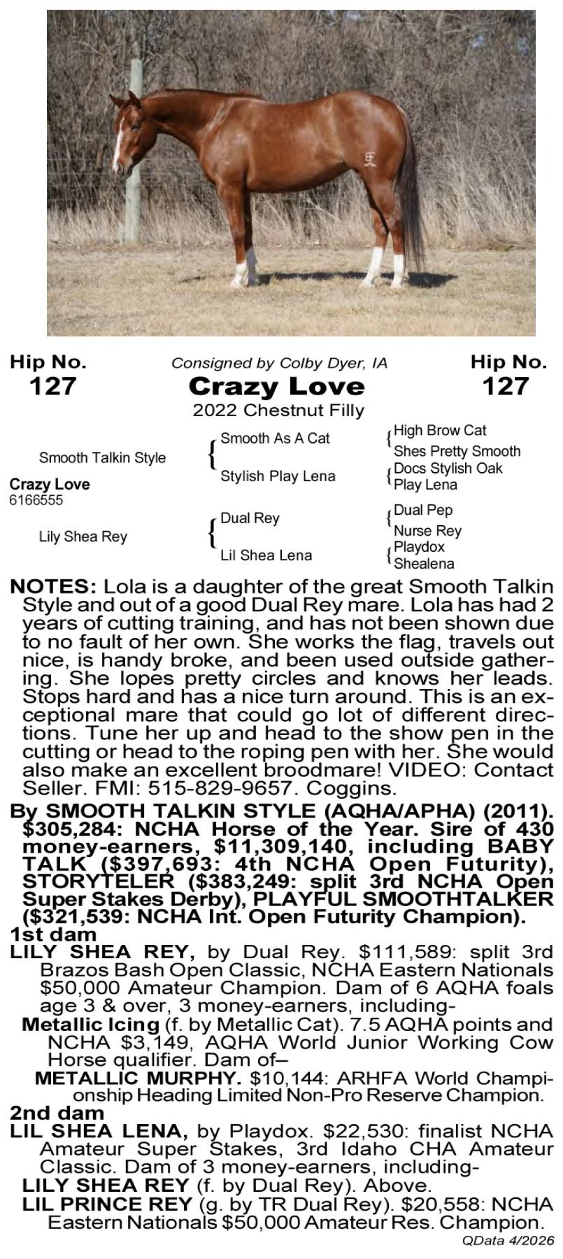 Crazy Love -6166555 - 2022 AQHA Chestnut Mare - Colby Dyer, Colfax, IA - Lola is an own daughter of the great Smooth Talkin Style and out of a good Dual Rey mare. Lola has had 2 years of cutting training. Has not been shown due to no fault of her own. She works the flag. Lola travels out nice and is handy broke. She’s been used outside gathering. She lopes pretty circles and knows her leads. Stops hard and has a nice turn around. This is an exceptional mare that could go lot of different directions. Tune her up and head to the show pen in the cutting or head to the roping pen with her. She would also make an excellent broodmare! VIDEO: Contact Seller. FMI: 515-829-9657. Coggins.
