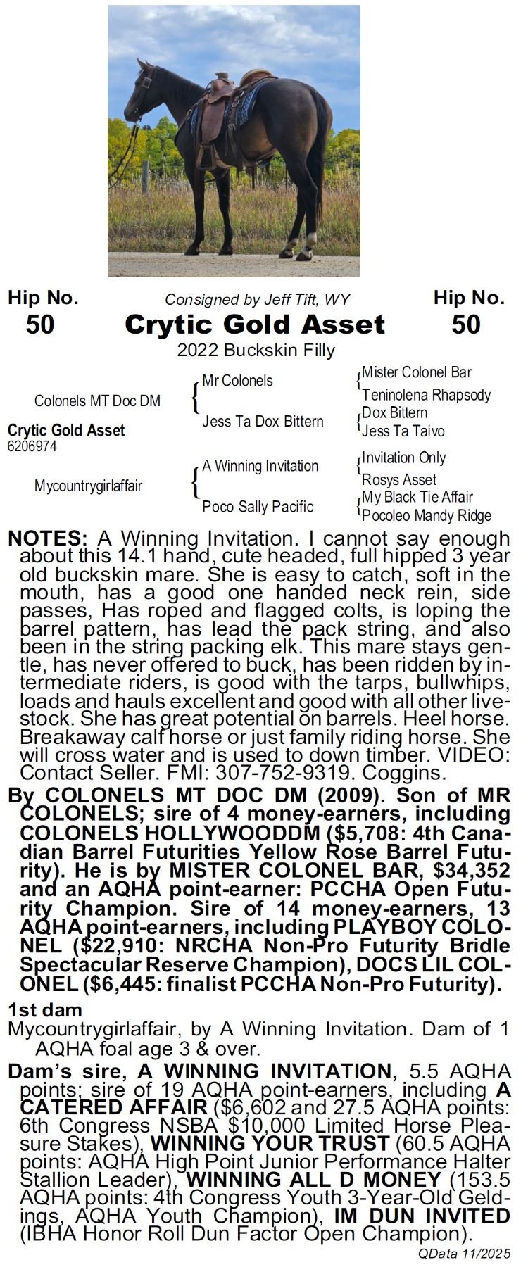 2022 AQHA Buckskin Mare x Colonels Mt Doc DM x Mr Colonels out of MyCountryGirlAffair x A Winning Invitation. I cannot say enough about this 14.1 hand, cute headed, full hipped 3 year old buckskin mare. She is easy to catch, soft in the mouth, has a good one handed neck rein, side passes, Been ridden both in the arena and mountains. Has roped and flagged colts, is loping the barrel pattern, has lead the pack string, and also been in the string packing elk. This mare stays gentle, has never offered to buck, has been ridden by intermediate riders, is good with the tarps, bullwhips, loads and hauls excellent and good with all other livestock. She has great potential as a barrel horse. Heel horse. Breakaway calf horse or just family riding horse. She will cross water and is used to down timber. VIDEO: Contact Seller. FMI: 307-752-9319. Coggins.