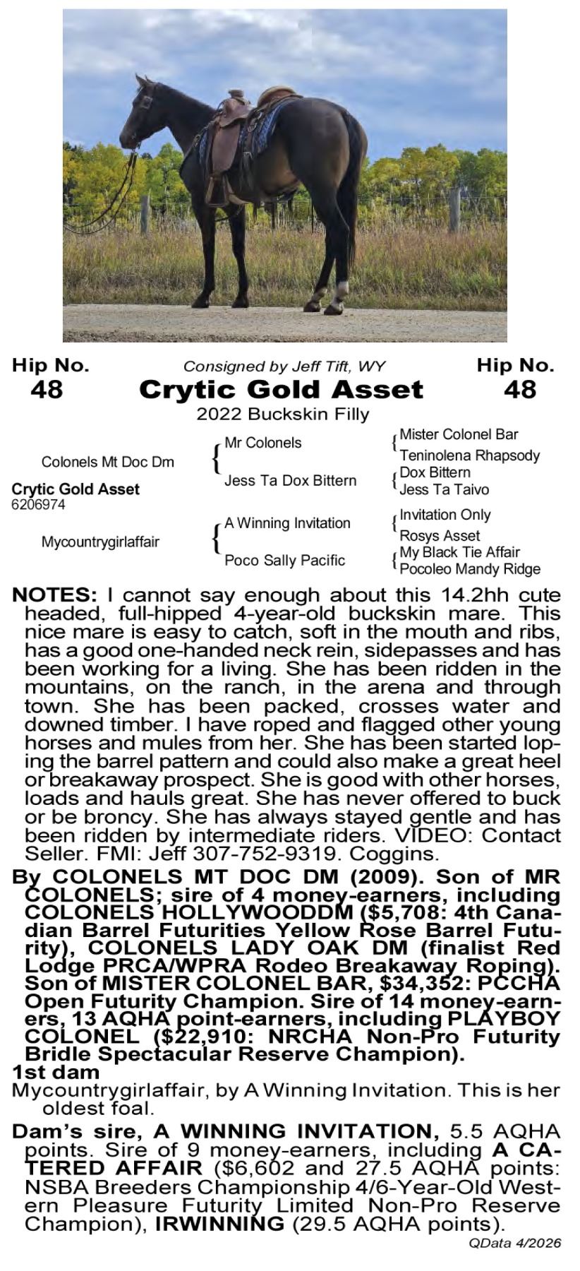 Crytic Gold Asset -6206974 - 2022 AQHA Buckskin Mare - Jeff Tift, Story, WY - I cannot say enough about this 14.2 hand cute headed, full hipped 4 year old Buckskin mare. This nice mare is easy to catch, soft in the mouth and ribs, Has a good one handed neck rein,sidepasses and has been working for a living. She has been ridden in the mountains, on the ranch, in the arena and through town. She has been packed and crosses water and downed timber. I have roped and flagged other young horses and mules from her. She has been started loping the barrel pattern and could also make a great heel or breakaway prospect. She is good with other horses, loads and hauls great. She has never offered to buck or be broncy, she has always stayed gentle and has been ridden by intermediate riders. VIDEO: Contact Seller. FMI: Jeff 307-752-9319. Coggins.