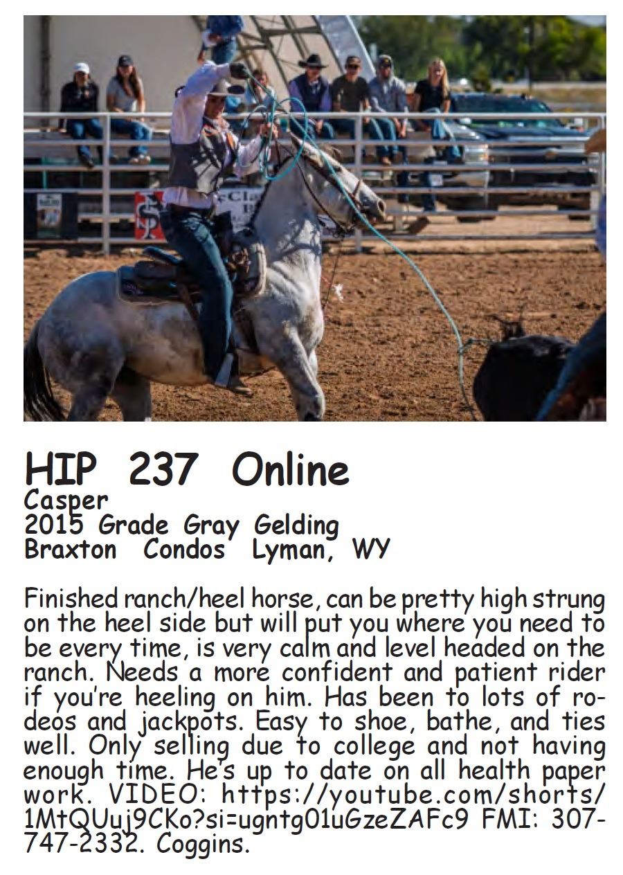 Csper - 2015 Grade Gray Gelding - Braxton Condos, Lyman, WY - Finished ranch/heel horse, can be pretty high strung on the heel side but will put you where you need to be every time, is very calm and level headed on the ranch. Needs a more confident and patient rider if you’re heeling on him. Has been to lots of rodeos and jackpots. Easy to shoe, bathe, and ties well. Only selling due to college and not having enough time. He’s up to date on all health paper work. VIDEO: https://youtube.com/shorts/1MtQUuj9CKo?si=ugntg01uGzeZAFc9 FMI: 307-747-2332. Coggins.