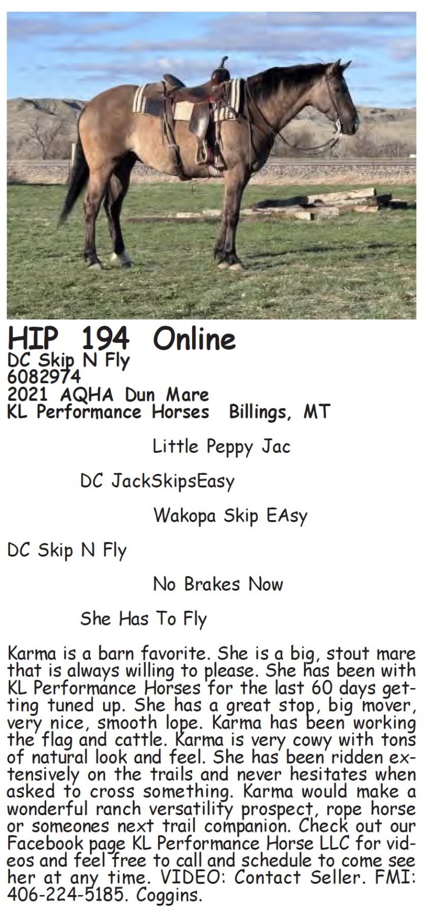 DC Skip N Fly - 6082974 - 2021 AQHA Dun Mare - KL Performance Horses, Billings, MT - Karma is a barn favorite. She is a big, stout mare that is always willing to please. She has been with KL Performance Horses for the last 60 days getting tuned up. She has a great stop, big mover, very nice, smooth lope. Karma has been working the flag and cattle. Karma is very cowy with tons of natural look and feel. She has been ridden extensively on the trails and never hesitates when asked to cross something. Karma would make a wonderful ranch versatility prospect, rope horse or someones next trail companion. Check out our Facebook page KL Performance Horse LLC for videos and feel free to call and schedule to come see her at any time. VIDEO: Contact Seller. FMI: 406-224-5185. Coggins.