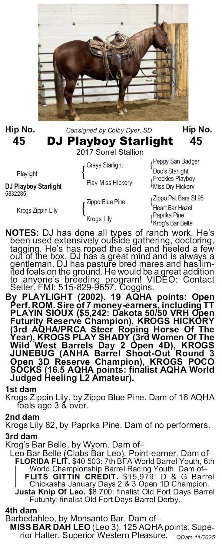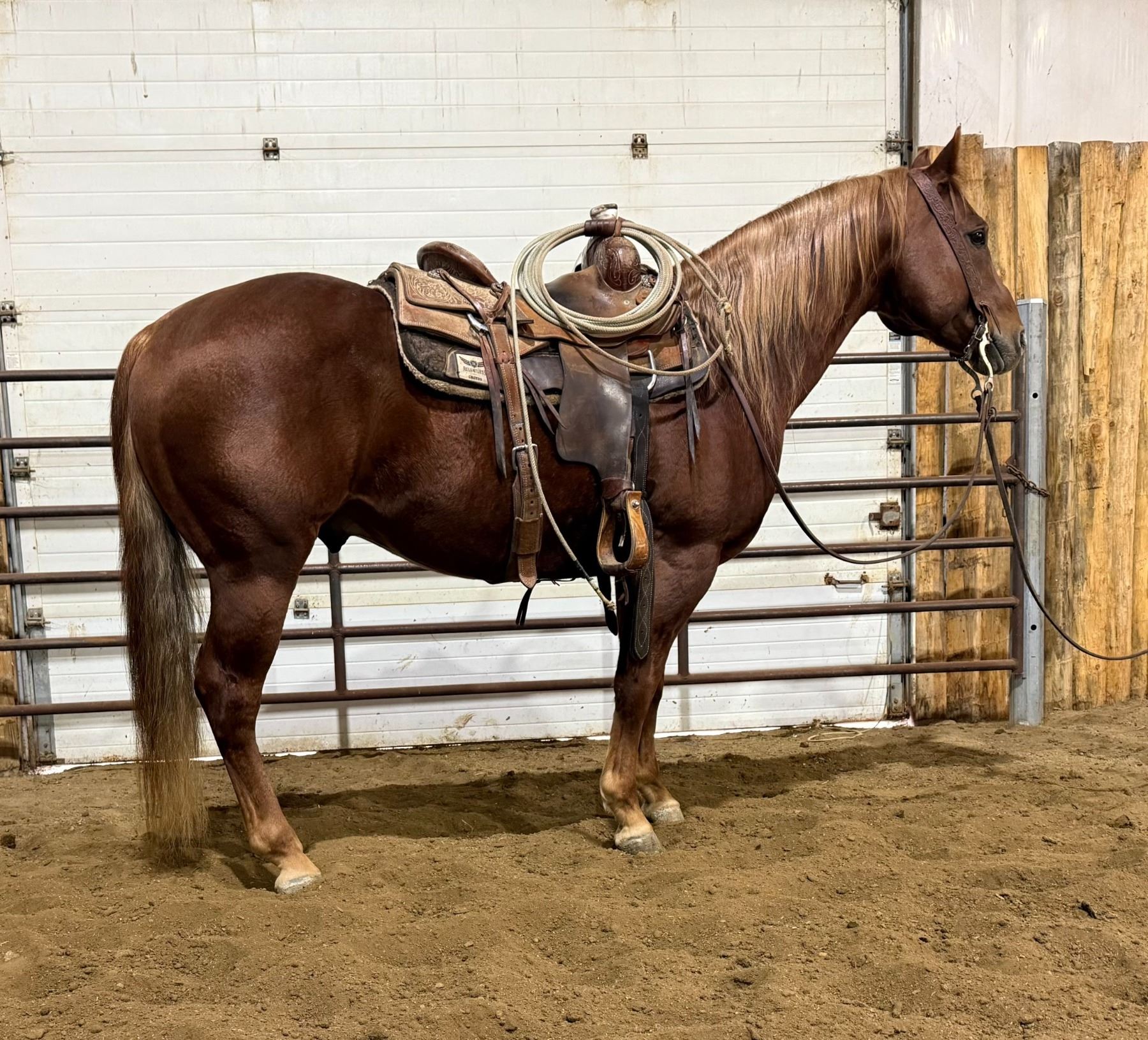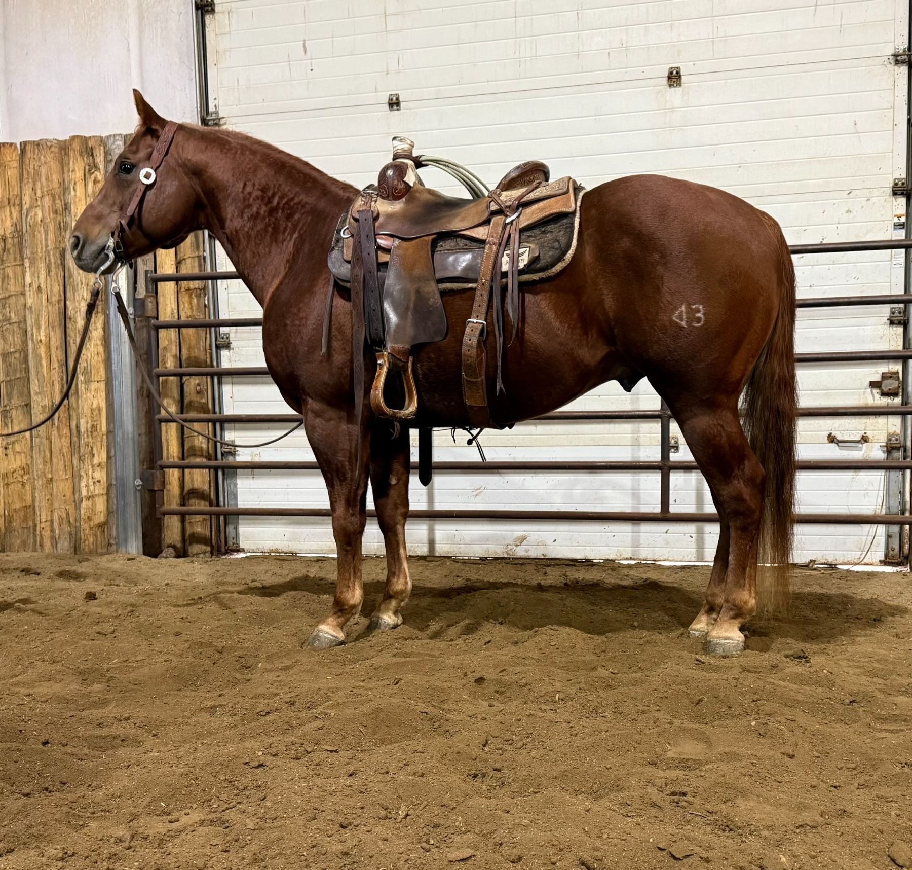 2017 AQHA Sorrel Stallion x Playlight x Grays Starlight out of Krogs Zippin Lily x Zippo Blue Pine. DJ has done all types of ranch work. He’s been used extensively outside gathering, doctoring, tagging. He’s has roped the sled and heeled a few out of the box. DJ has a great mind and is always a gentleman. DJ has pasture bred mares and has limited foals on the ground. He would be a great addition to anyone’s breeding program! VIDEO: Contact Seller. FMI: 515-829-9657. Coggins.