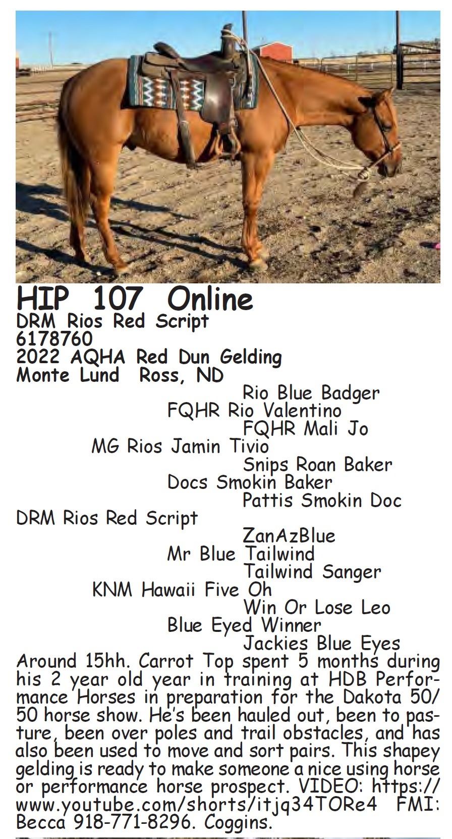 DRM Rios Red Script - 6178760 - 2022 AQHA Red Dun Gelding - Monte Lund, Ross, ND - Around 15hh. Carrot Top spent 5 months during his 2 year old year in training at HDB Performance Horses in preparation for the Dakota 50/50 horse show. He’s been hauled out, been to pasture, been over poles and trail obstacles, and has also been used to move and sort pairs. This shapey gelding is ready to make someone a nice using horse or performance horse prospect. VIDEO: https://www.youtube.com/shorts/itjq34TORe4 FMI: Becca 918-771-8296. Coggins.