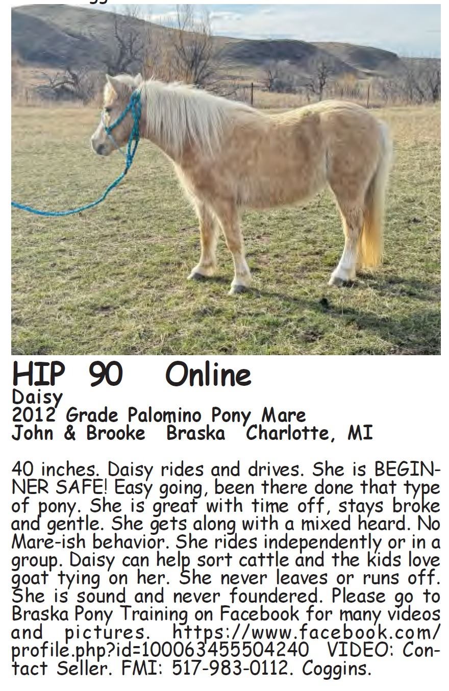 Daisy - 2012 Grade Palomino Pony Mare - John & Brooke Braska, Charlotte, MI - 40 inches. Daisy rides and drives. She is BEGINNER SAFE! Easy going, been there done that type of pony. She is great with time off, stays broke and gentle. She gets along with a mixed heard. No Mare-ish behavior. She rides independently or in a group. Daisy can help sort cattle and the kids love goat tying on her. She never leaves or runs off. She is sound and never foundered. Please go to Braska Pony Training on Facebook for many videos and pictures. https://www.facebook.com/profile.php?id=100063455504240 VIDEO: Contact Seller. FMI: 517-983-0112. Coggins.
