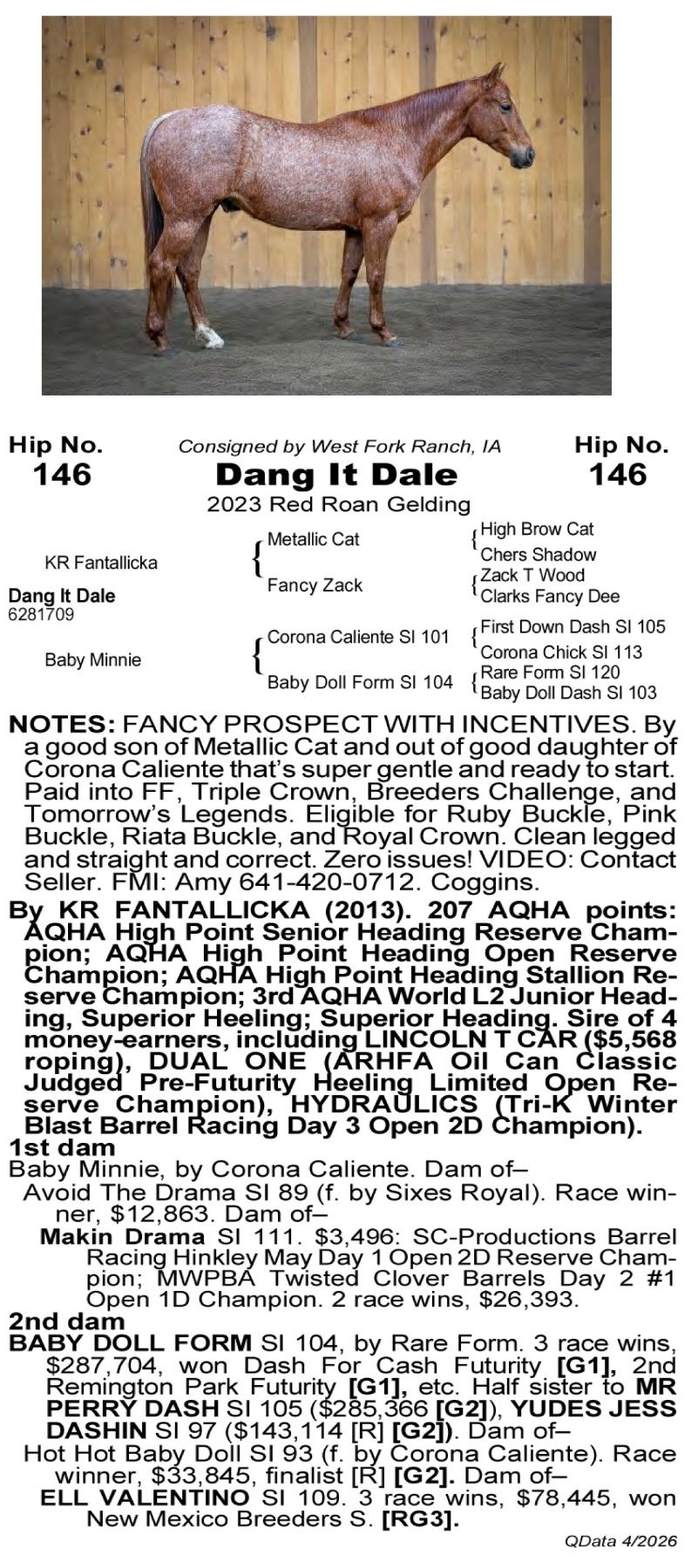 Dang It Dale -6281709 - 2023 AQHA Red Roan Gelding - West Fork Ranch, Sheffield, IA - FANCY PROSPECT WITH INCENTIVES. by a good son of Metallic Cat and out of good daughter of Corona Caliente that’s super gentle and ready to start. Paid into FF, Triple Crown, Breeders Challenge, and Tomorrow’s Legends. Eligible for Ruby Buckle, Pink Buckle, Riata Buckle, and Royal Crown. Clean legged and straight and correct. Zero issues! VIDEO: Contact Seller. FMI: Amy 641-420-0712. Coggins.