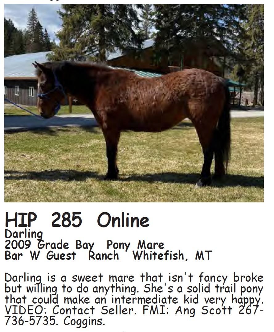 Darling - 2009 Grade Bay Pony Mare - Bar W Guest Ranch, Whitefish, MT - Darling is a sweet mare that isn't fancy broke but willing to do anything. She's a solid trail pony that could make an intermediate kid very happy. VIDEO: Contact Seller. FMI: Ang Scott 267-736-5735. Coggins.