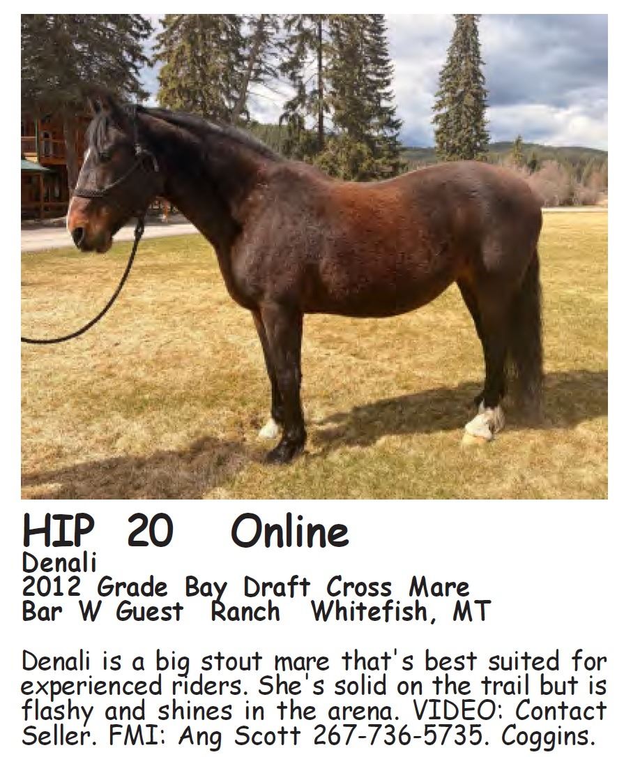 Denali - 2012 Grade Bay Draft Cross Mare - Bar W Guest Ranch, Whitefish, MT - Denali is a big stout mare that's best suited for experienced riders. She's solid on the trail but is flashy and shines in the arena. VIDEO: Contact Seller. FMI: Ang Scott 267-736-5735. Coggins.