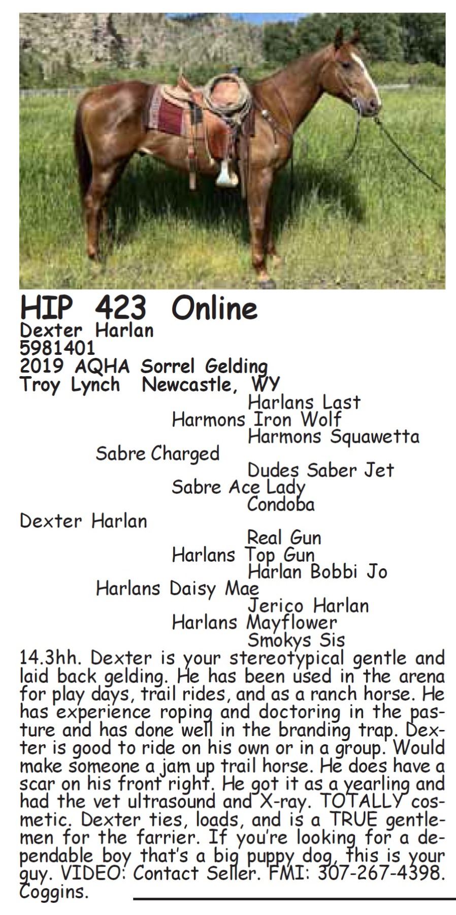 14.3hh. Dexter is your stereotypical gentle and laid back gelding. He has been used in the arena for play days, trail rides, and as a ranch horse. He has experience roping and doctoring in the pasture and has done well in the branding trap. Dexter is good to ride on his own or in a group. Would make someone a jam up trail horse. He does have a scar on his front right. He got it as a yearling and had the vet ultrasound and X-ray. TOTALLY cosmetic. Dexter ties, loads, and is a TRUE gentlemen for the farrier. If you’re looking for a dependable boy that’s a big puppy dog, this is your guy. VIDEO: Contact Seller. FMI: 307-267-4398. Coggins.