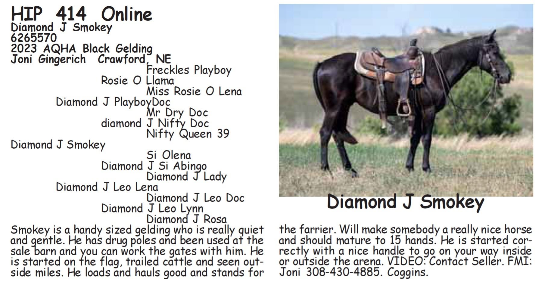 Smokey is a handy sized gelding who is really quiet and gentle. He has drug poles and been used at the sale barn and you can work the gates with him. He is started on the flag, trailed cattle and seen outside miles. He loads and hauls good and stands for the farrier. Will make somebody a really nice horse and should mature to 15 hands. He is started correctly with a nice handle to go on your way inside or outside the arena. VIDEO: Contact Seller. FMI: Joni 308-430-4885. Coggins.