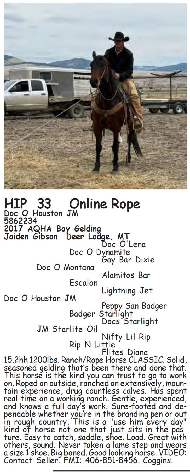Doc O Houston JM - 5862234 - 2017 AQHA Bay Gelding - Jaiden Gibson, Deer Lodge, MT - 15.2hh 1200lbs. Ranch/Rope Horse CLASSIC. Solid, seasoned gelding that’s been there and done that. This horse is the kind you can trust to go to work on. Roped on outside, ranched on extensively, mountain experience, drug countless calves. Has spent real time on a working ranch. Gentle, experienced, and knows a full day’s work. Sure-footed and dependable whether you’re in the branding pen or out in rough country. This is a "use him every day" kind of horse not one that just sits in the pasture. Easy to catch, saddle, shoe. Load. Great with others, sound. Never taken a lame step and wears a size 1 shoe. Big boned. Good looking horse. VIDEO: Contact Seller. FMI: 406-851-8456. Coggins.