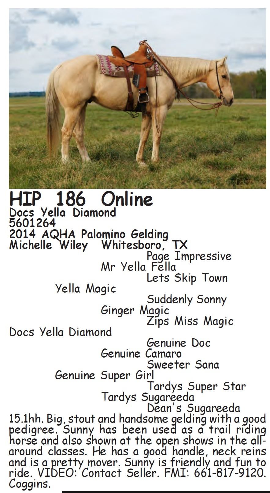 Docs Yella Diamond - 5601264 - 2014 AQHA Palomino Gelding - Michelle Wiley, Whitesboro, TX - 15.1hh. Big, stout and handsome gelding with a good pedigree. Sunny has been used as a trail riding horse and also shown at the open shows in the all-around classes. He has a good handle, neck reins and is a pretty mover. Sunny is friendly and fun to ride. VIDEO: Contact Seller. FMI: 661-817-9120. Coggins.
